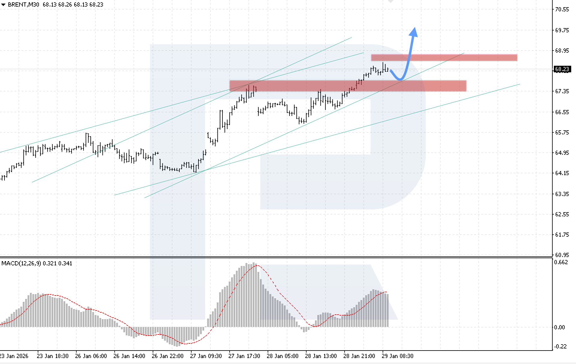 บนกราฟ M30 ของน้ำมันดิบ Brent ตลาดกำลังปรับตัวขึ้นหลังจากทะลุแนวต้านระยะสั้น โดยแนวรับใกล้ที่สุดของ Brent อยู่ที่ระดับ 67.45 วันนี้ 29 มกราคม 2026 อาจเกิดการปรับฐานลงไปยังระดับแนวรับนี้ หลังจากการปรับตัวลงเสร็จสิ้น คาดว่าโมเมนตัมขาขึ้นจะกลับมาอีกครั้ง โดยมีเป้าหมายที่ระดับ 69.85