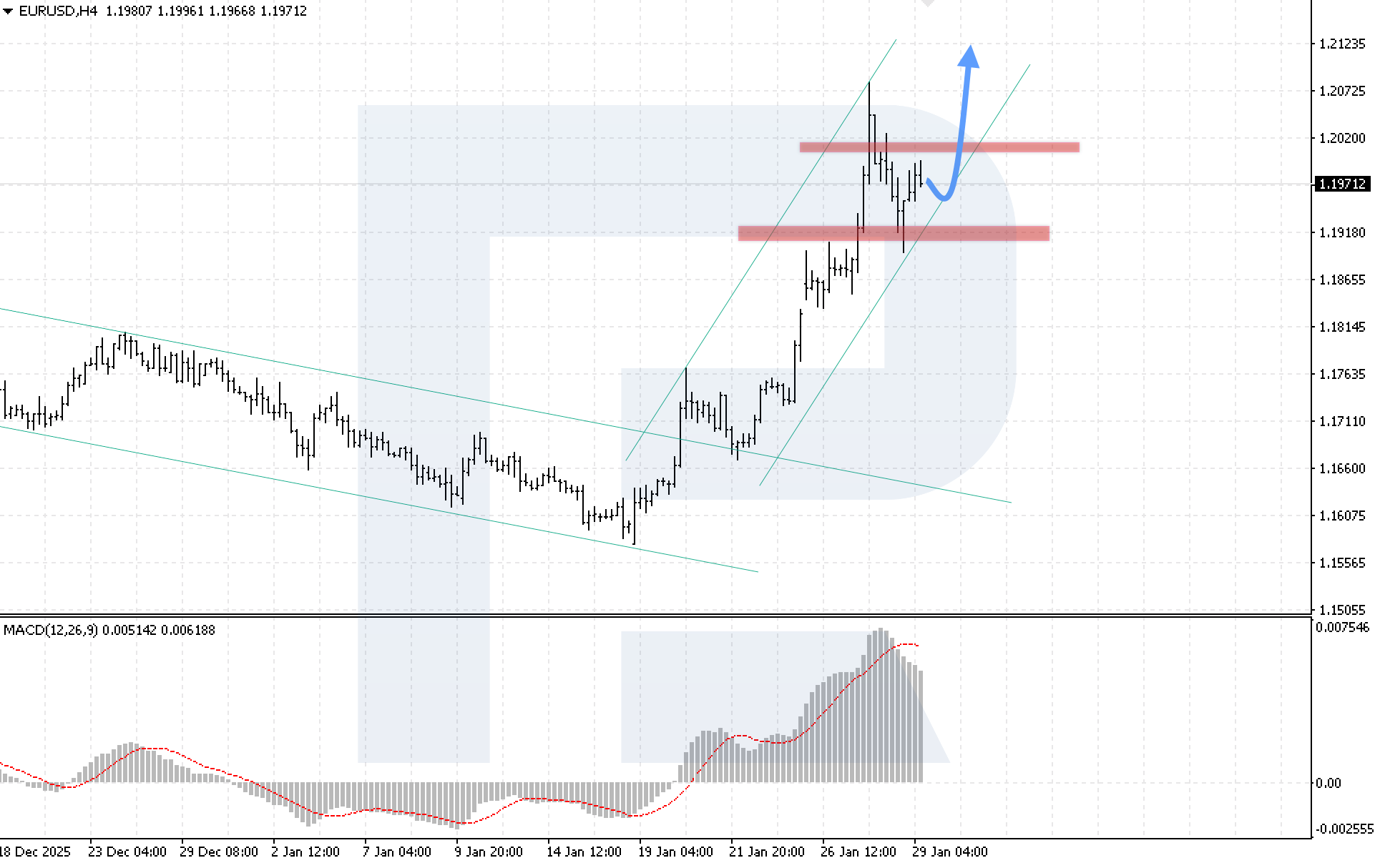 ภาพทางเทคนิคสนับสนุนสถานการณ์นี้ โดยราคายังคงเคลื่อนไหวอยู่ภายในช่องขาขึ้น ขณะที่การวิเคราะห์อินดิเคเตอร์ MACD แสดงให้เห็นว่าฮิสโตแกรมปรับตัวลดลง ซึ่งยืนยันถึงช่วงการสะสมกำลัง เงื่อนไขสำคัญสำหรับสถานการณ์ขาขึ้นของ EURUSD คือราคาจะต้องยืนเหนือแนวต้านใกล้ที่สุดที่ระดับ 1.2020 ได้อย่างมั่นคง