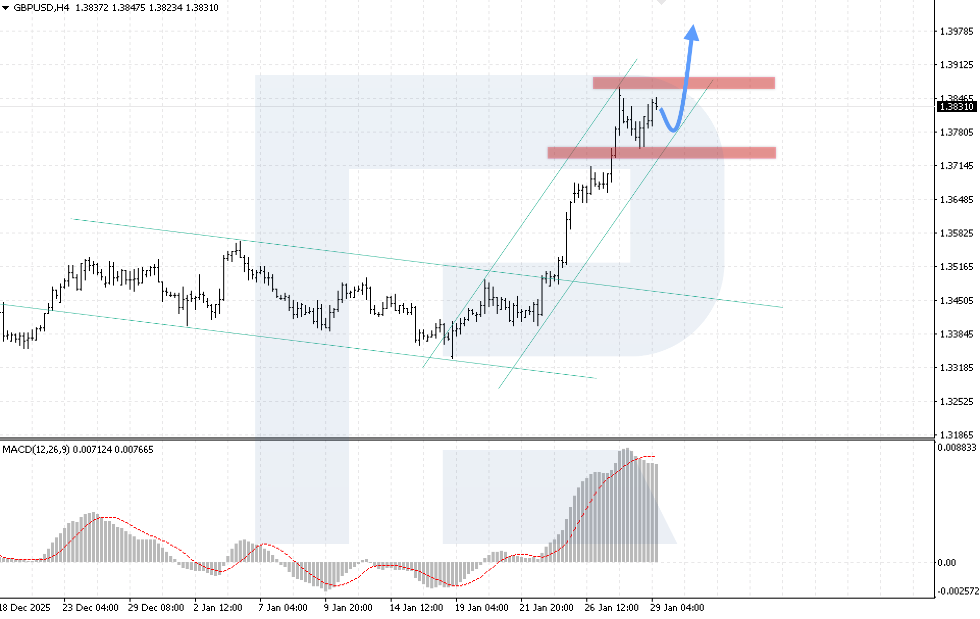 บนกราฟ H4 ของคู่สกุลเงิน GBPUSD ตลาดกำลังปรับตัวขึ้นหลังจากดีดตัวขึ้นจากแนวรับ โดยแนวต้านใกล้ที่สุดของ GBPUSD อยู่ที่ระดับ 1.3855 วันนี้ 29 มกราคม 2026 การปรับฐานขาลงอาจสิ้นสุดลง และการปรับตัวขึ้นอาจดำเนินต่อไปยังระดับ 1.3975