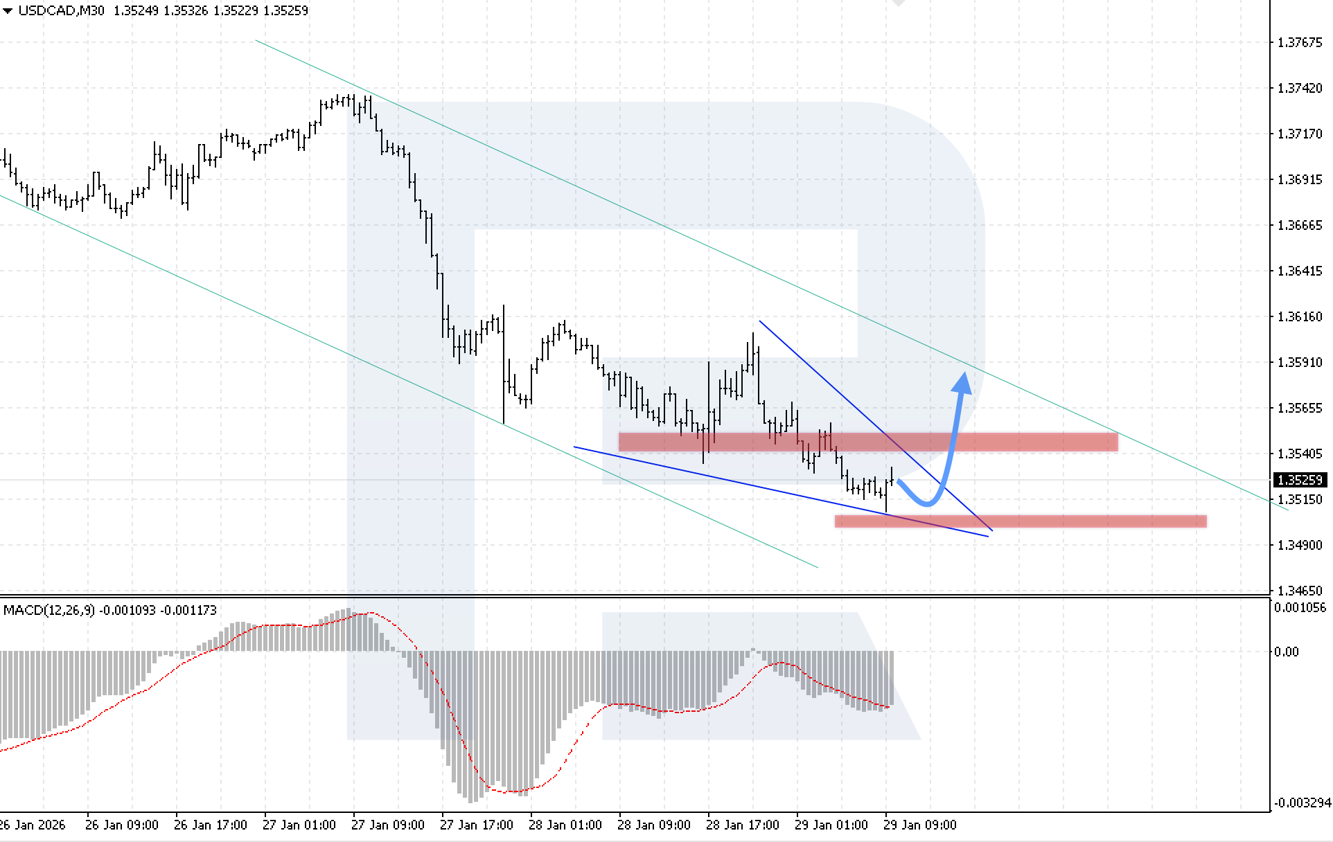 บนกราฟ M30 ของคู่สกุลเงิน USDCAD ตลาดเริ่มชะลอการปรับตัวลง และแสดงสัญญาณของการก่อตัวรูปแบบกลับตัว Wedge แนวรับใกล้ที่สุดของ USDCAD อยู่ที่ระดับ 1.3495 วันนี้ 29 มกราคม 2026 อาจเกิดการปรับฐานขึ้นไปยังระดับ 1.3515 หลังจากช่วงการสะสมกำลังเสร็จสิ้น คาดว่าโมเมนตัมขาขึ้นจะกลับมา โดยมีเป้าหมายที่ระดับ 1.3585