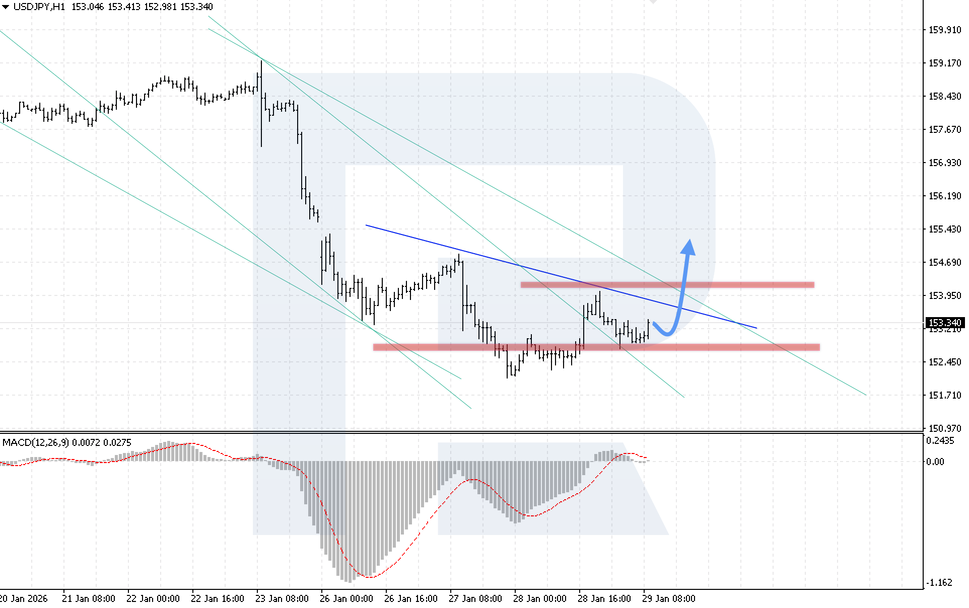 ภาพทางเทคนิคสนับสนุนสถานการณ์นี้ โดยรูปแบบกลับตัวกำลังใกล้สมบูรณ์ การวิเคราะห์อินดิเคเตอร์ MACD แสดงให้เห็นว่าฮิสโตแกรมปรับตัวเพิ่มขึ้นและยืนเหนือเส้นศูนย์ ซึ่งบ่งชี้ถึงแรงซื้อที่กลับมาอีกครั้ง เงื่อนไขสำคัญสำหรับสถานการณ์ขาขึ้นของ USDJPY คือราคาจะต้องยืนเหนือระดับ 154.05 ได้อย่างชัดเจน