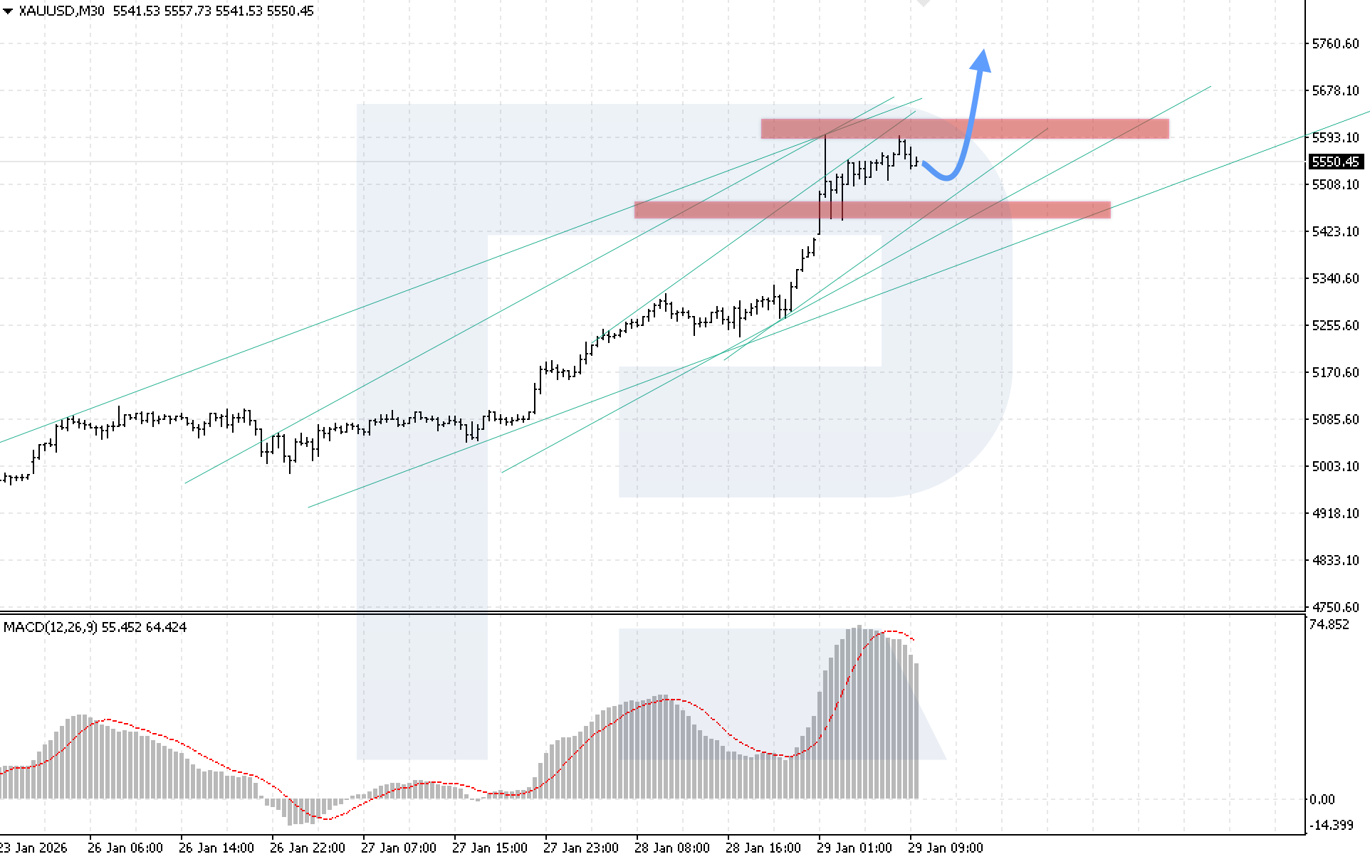 บนกราฟ M30 ของคู่สกุลเงิน XAUUSD ตลาดกำลังปรับตัวขึ้นอย่างแข็งแกร่ง แต่ฝั่งผู้ซื้อเริ่มเผชิญแรงต้านที่ระดับ 5,595 โดยแนวรับใกล้ที่สุดของ XAUUSD อยู่ที่ระดับ 5,495 วันนี้ 29 มกราคม 2026 มีแนวโน้มที่จะเกิดการปรับฐานลงไปยังขอบล่างของช่อง หลังจากการปรับตัวลงเสร็จสิ้น คาดว่าคู่เงินจะกลับมามีโมเมนตัมขาขึ้นอีกครั้ง โดยมีเป้าหมายที่ระดับ 5,765