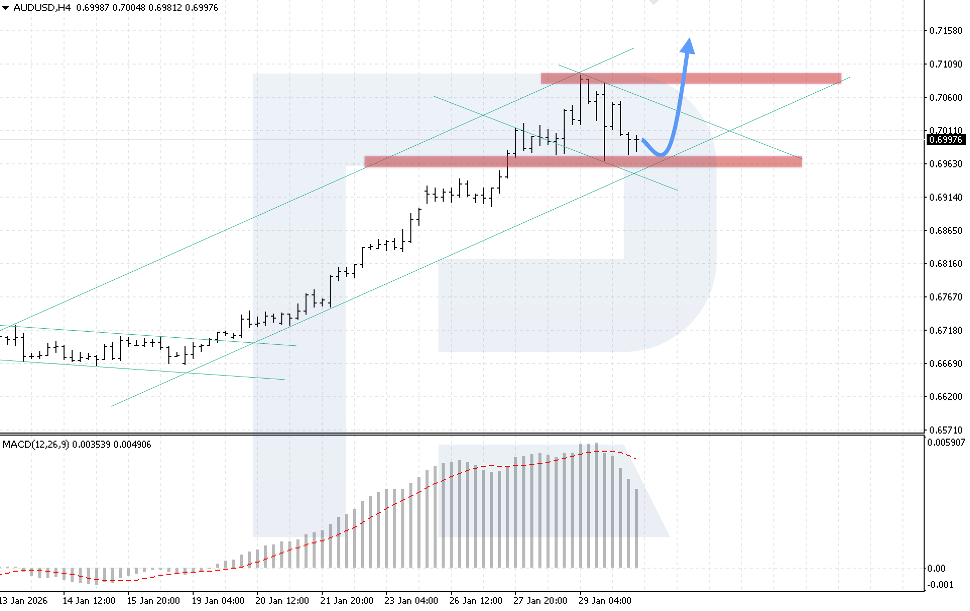 บนกราฟ H4 ของคู่สกุลเงิน AUDUSD ตลาดยังคงเคลื่อนไหวอยู่ในช่วงการปรับฐาน โดยดีดตัวขึ้นจากแนวรับสำคัญที่ระดับ 0.6965 แนวต้านใกล้ที่สุดอยู่ที่ระดับ 0.7095 วันนี้ 30 มกราคม 2026 การปรับฐานขาลงอาจสิ้นสุดลง และโมเมนตัมขาขึ้นอาจกลับมาอีกครั้ง โดยมีเป้าหมายที่ระดับ 0.7145