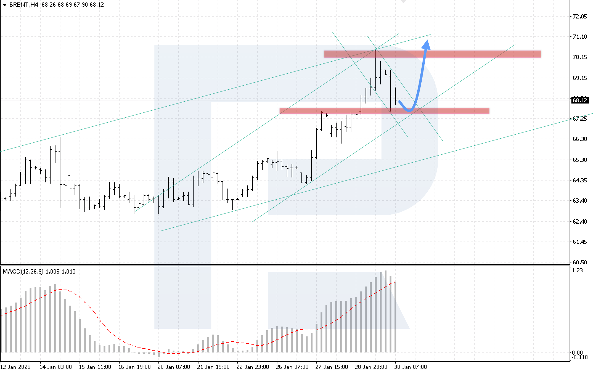 บนกราฟ H4 ของน้ำมันดิบ Brent ตลาดกำลังอยู่ในช่วงการปรับฐานหลังจากดีดตัวขึ้นจากขอบบนของช่องขาขึ้น แนวรับใกล้ที่สุดอยู่ที่ระดับ 67.45 ซึ่งฝั่งผู้ซื้อสามารถป้องกันไม่ให้ราคาทะลุลงได้ วันนี้ 30 มกราคม 2026 มีความเป็นไปได้ที่โมเมนตัมขาขึ้นจะกลับมาอีกครั้ง โดยมีเป้าหมายที่ระดับ 71.10