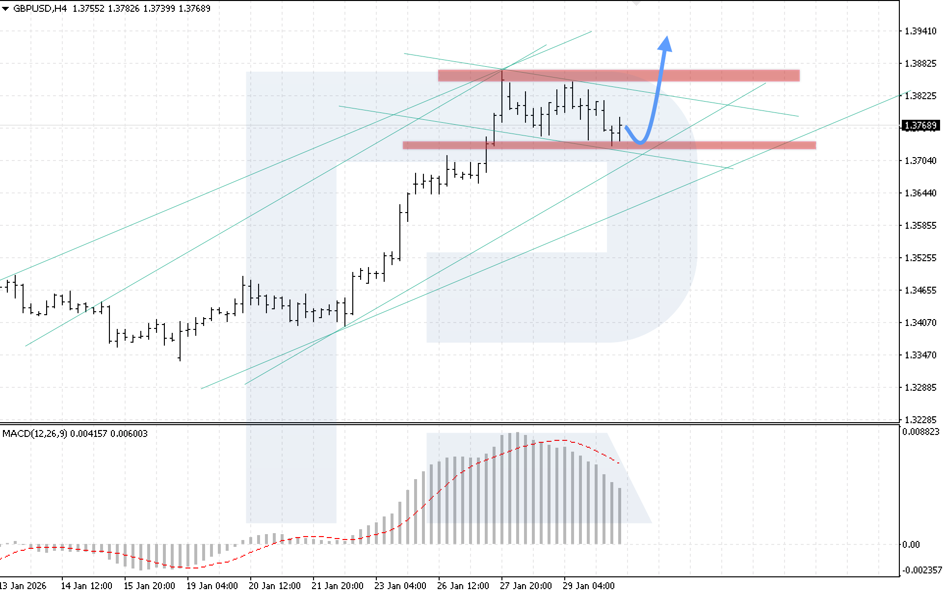 บนกราฟ H4 ของคู่สกุลเงิน GBPUSD ตลาดกำลังดีดตัวขึ้นจากแนวรับที่ระดับ 1.3755 โดยแนวต้านใกล้ที่สุดอยู่ที่ระดับ 1.3845 วันนี้ 30 มกราคม 2026 การปรับฐานอาจสิ้นสุดลง และโมเมนตัมขาขึ้นอาจกลับมาอีกครั้ง โดยมีเป้าหมายที่ระดับ 1.3945