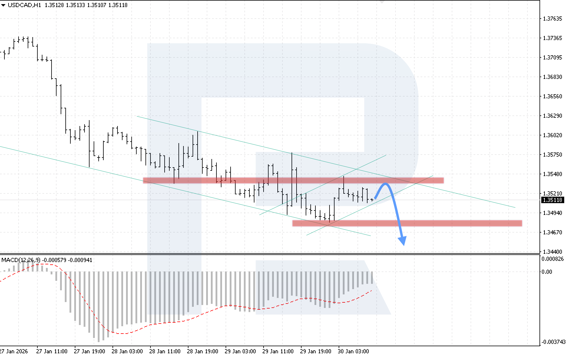 บนกราฟ H1 ของคู่สกุลเงิน USDCAD ตลาดไม่สามารถยืนเหนือขอบบนของช่องขาลงได้ และยังคงปรับตัวลงต่อ โดยแนวรับใกล้ที่สุดอยู่ที่ระดับ 1.3480 วันนี้ 30 มกราคม 2026 อาจเกิดการดีดตัวระยะสั้นขึ้นไปยังระดับ 1.3515 หลังจากนั้นโมเมนตัมขาลงอาจกลับมาอีกครั้ง โดยมีเป้าหมายที่ระดับ 1.3435