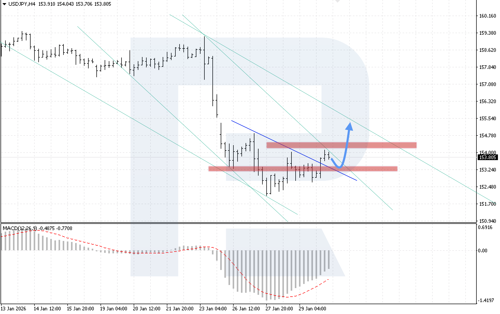 บนกราฟ H4 ของคู่สกุลเงิน USDJPY ตลาดยังคงปรับตัวขึ้นต่อเนื่องหลังจากทะลุขอบบนของรูปแบบกลับตัว Head and Shoulders โดยฝั่งผู้ซื้อเริ่มเผชิญแรงต้านที่ขอบบนของช่องขาลง แนวรับใกล้ที่สุดอยู่ที่ระดับ 153.25 วันนี้ 30 มกราคม 2026 โมเมนตัมฝั่งขาขึ้นอาจพัฒนาต่อไป โดยมีเป้าหมายที่ระดับ 155.45 ซึ่งเป็นส่วนหนึ่งของการสิ้นสุดรูปแบบกลับตัวดังกล่าว