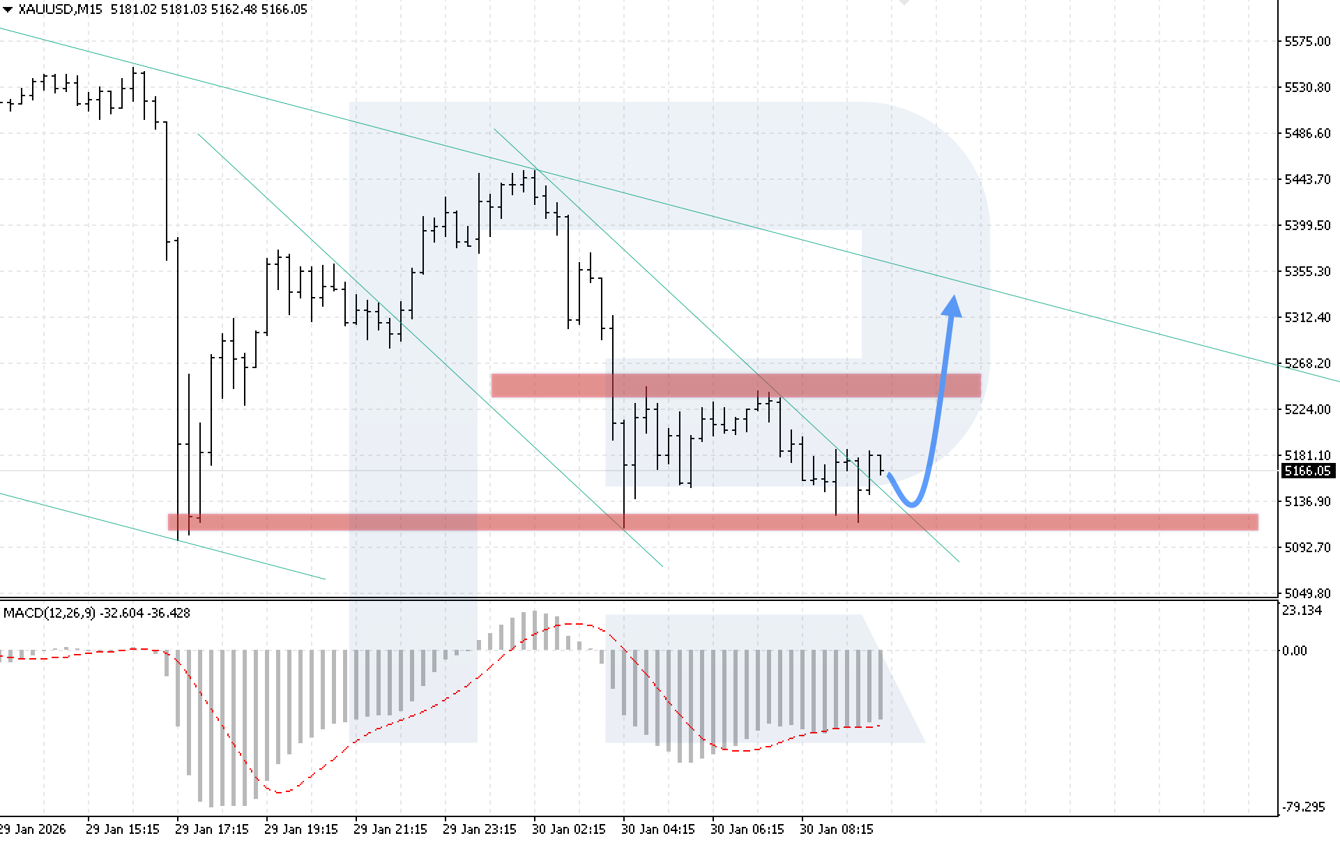บนกราฟ M15 ของคู่สกุลเงิน XAUUSD ตลาดยังคงปรับตัวลงต่อเนื่อง โดยฝั่งผู้ขายกำลังทดสอบแนวรับสำคัญที่ระดับ 5,105 อย่างต่อเนื่อง แนวต้านใกล้ที่สุดอยู่ที่ระดับ 5,240 วันนี้ 30 มกราคม 2026 ราคามีโอกาสดีดตัวขึ้นจากขอบล่างของรูปแบบกลับตัว Double Bottom หลังจากการปรับตัวลงเสร็จสิ้น โมเมนตัมขาขึ้นอาจกลับมา โดยมีเป้าหมายที่ระดับ 5,315