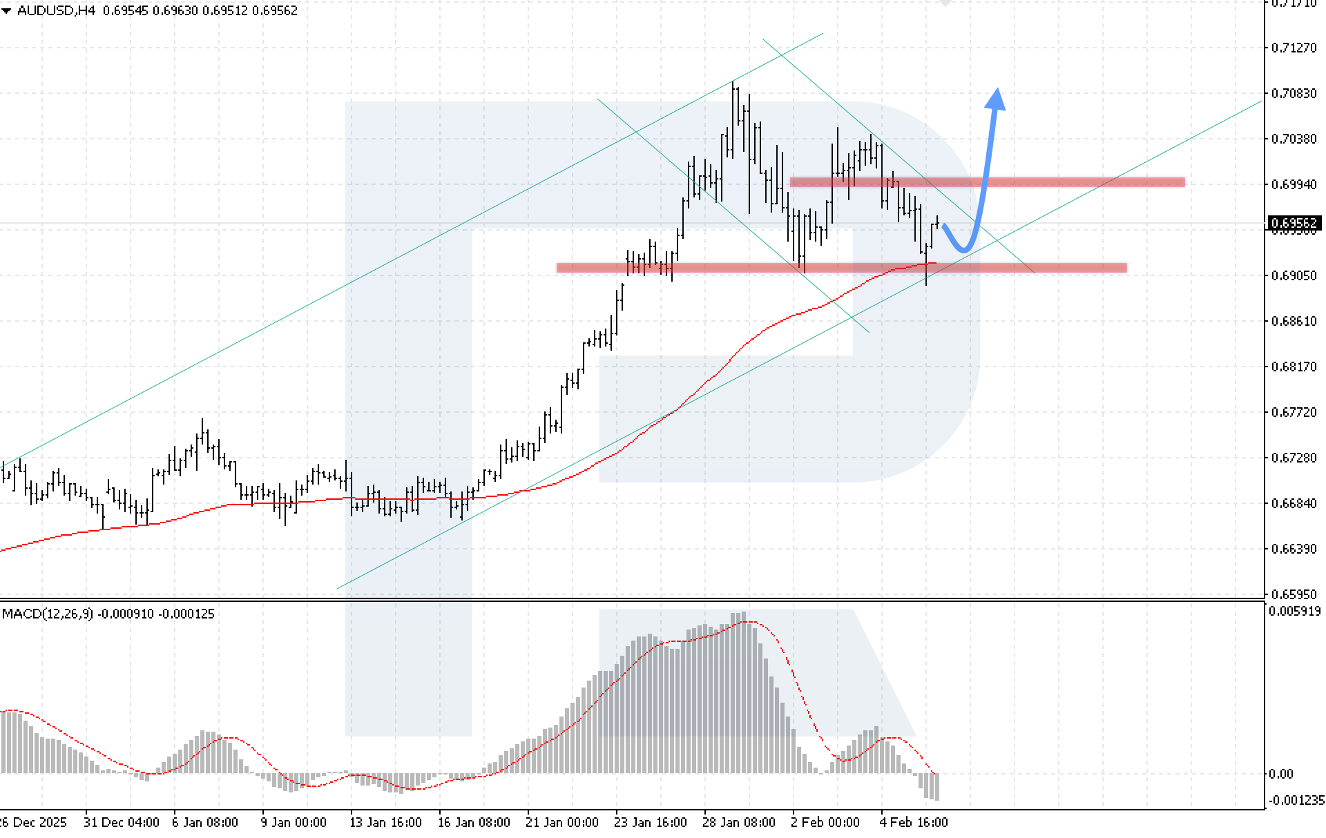 ภาพทางเทคนิคยืนยันสถานการณ์นี้ โดยอินดิเคเตอร์ MACD แสดงการชะลอตัวของการลดลงของฮิสโตแกรม ซึ่งบ่งชี้ถึงการสิ้นสุดของการเคลื่อนไหวขาลง เงื่อนไขสำคัญสำหรับสถานการณ์ขาขึ้นคือราคาจะต้องยืนเหนือระดับ 0.6985 ได้ ซึ่งจะยืนยันการทะลุขอบบนของช่องขาลง