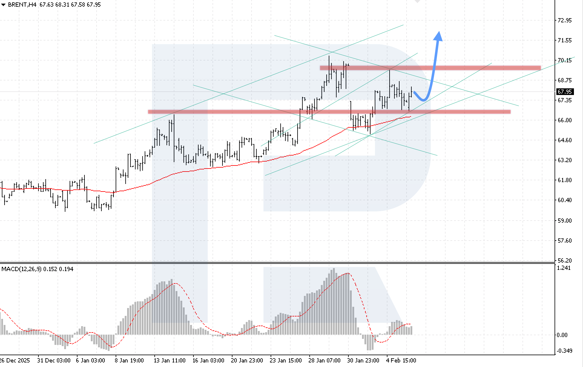 ภาพทางเทคนิคยืนยันสถานการณ์ขาขึ้น โดยอินดิเคเตอร์ MACD แสดงการเติบโตของฮิสโตแกรม ซึ่งสะท้อนถึงการพัฒนาของอิมพัลส์ขาขึ้น เงื่อนไขสำคัญสำหรับสถานการณ์นี้คือราคาจะต้องยืนเหนือระดับ 69.05 ได้ ซึ่งจะยืนยันการทะลุขอบบนของช่องปรับฐานขาลง