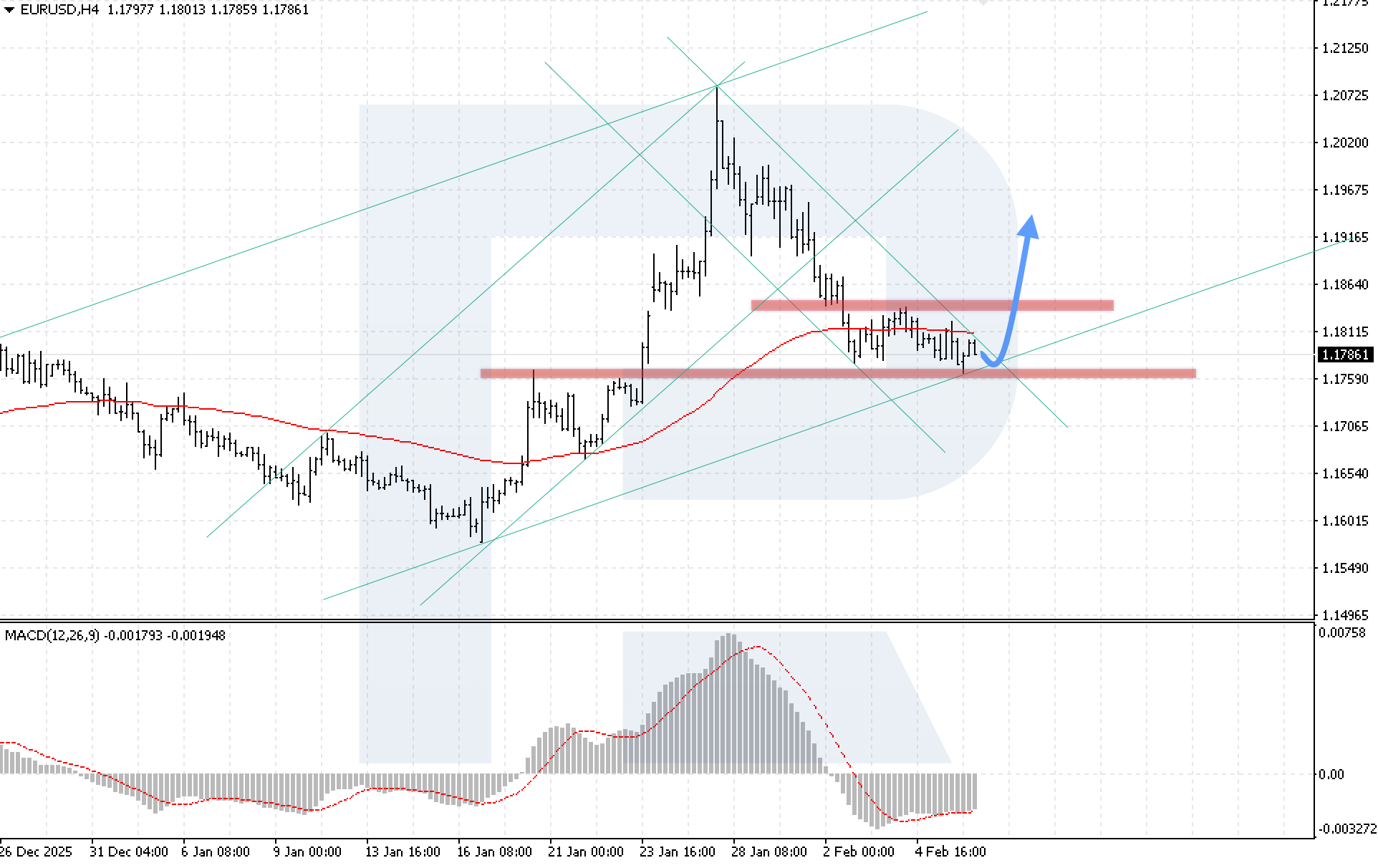 ภาพทางเทคนิคสนับสนุนสถานการณ์นี้ โดยอินดิเคเตอร์ MACD แสดงการเติบโตของฮิสโตแกรม และเริ่มก่อตัวเป็น bullish divergence เงื่อนไขสำคัญสำหรับการปรับตัวขึ้นคือราคาจะต้องยืนเหนือระดับ 1.1845 ได้อย่างมั่นคง ซึ่งจะยืนยันการทะลุขอบบนของรูปแบบกลับตัว และเพิ่มโอกาสในการไปถึงเป้าหมายของรูปแบบ