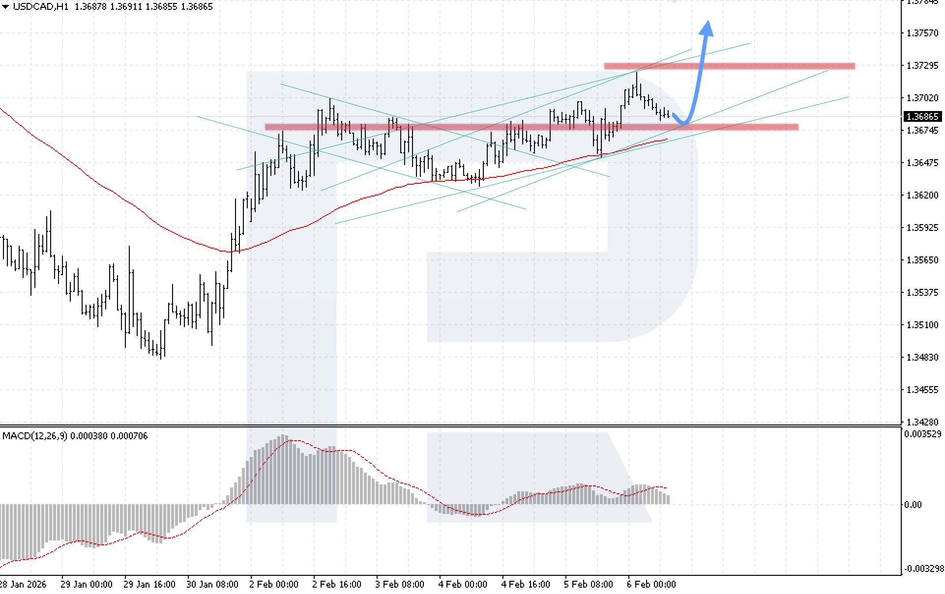 ภาพทางเทคนิคยืนยันสถานการณ์ขาขึ้น โดยอินดิเคเตอร์ MACD แสดงการชะลอตัวของการลดลงของฮิสโตแกรม ซึ่งบ่งชี้ถึงแรงขายที่อ่อนลง เงื่อนไขสำคัญสำหรับการปรับตัวขึ้นต่อเนื่องคือราคาจะต้องยืนเหนือแนวต้านในระยะสั้นที่ระดับ 1.3705 ได้ ซึ่งจะยืนยันความแข็งแกร่งของฝั่งขาขึ้น