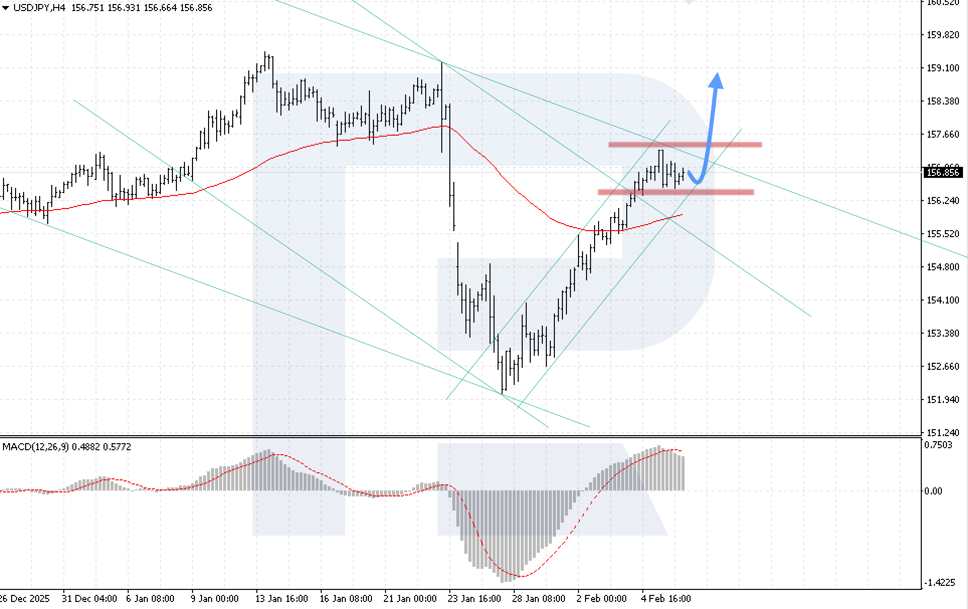 บนกราฟ H4 ของ USDJPY ตลาดอยู่ในช่วงสะสมราคาหลังจากทดสอบขอบบนของช่องขาลง แนวรับใกล้ที่สุดอยู่ที่ระดับ 156.40 วันนี้ 6 กุมภาพันธ์ 2026 โมเมนตัมขาขึ้นมีแนวโน้มจะดำเนินต่อไป โดยมีเป้าหมายที่ระดับ 159.10