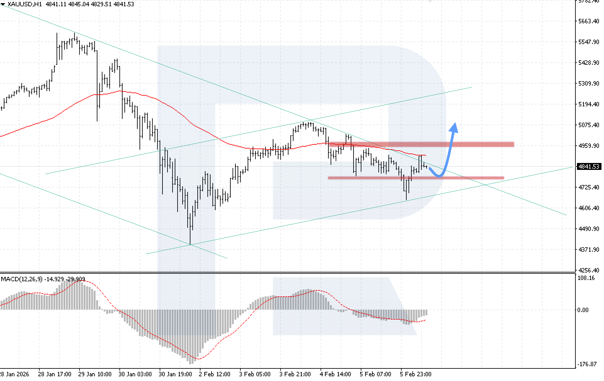 ภาพทางเทคนิคยืนยันสถานการณ์นี้ โดยอินดิเคเตอร์ MACD แสดงการเติบโตของฮิสโตแกรม ซึ่งสะท้อนถึงการสิ้นสุดของช่วงปรับฐานและความเป็นไปได้ของการกลับมาของโมเมนตัมขาขึ้น เงื่อนไขสำคัญสำหรับสถานการณ์ขาขึ้นคือราคาจะต้องยืนเหนือระดับ 4,965 ได้ ซึ่งจะยืนยันความแข็งแกร่งของฝั่งผู้ซื้อและบ่งชี้ถึงการทะลุขอบบนของช่องขาลง