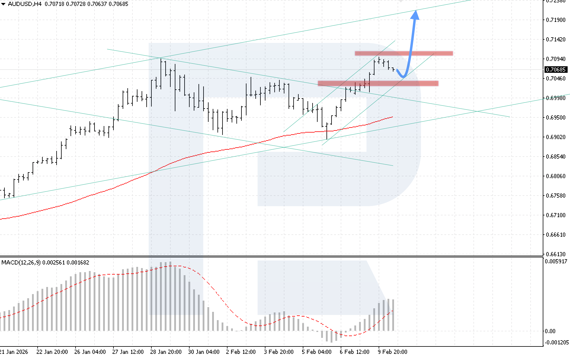บนกราฟ H4 ของ AUDUSD ตลาดแสดงการปรับฐานหลังจากดีดตัวลงจากแนวต้านที่ระดับ 0.7095 อย่างไรก็ตาม แรงซื้อยังคงอยู่ วันนี้ 10 กุมภาพันธ์ 2026 โมเมนตัมขาขึ้นอาจดำเนินต่อไป โดยมีเป้าหมายที่ระดับ 0.7195 หลังจากการดีดตัวจากแนวรับที่ระดับ 0.7045