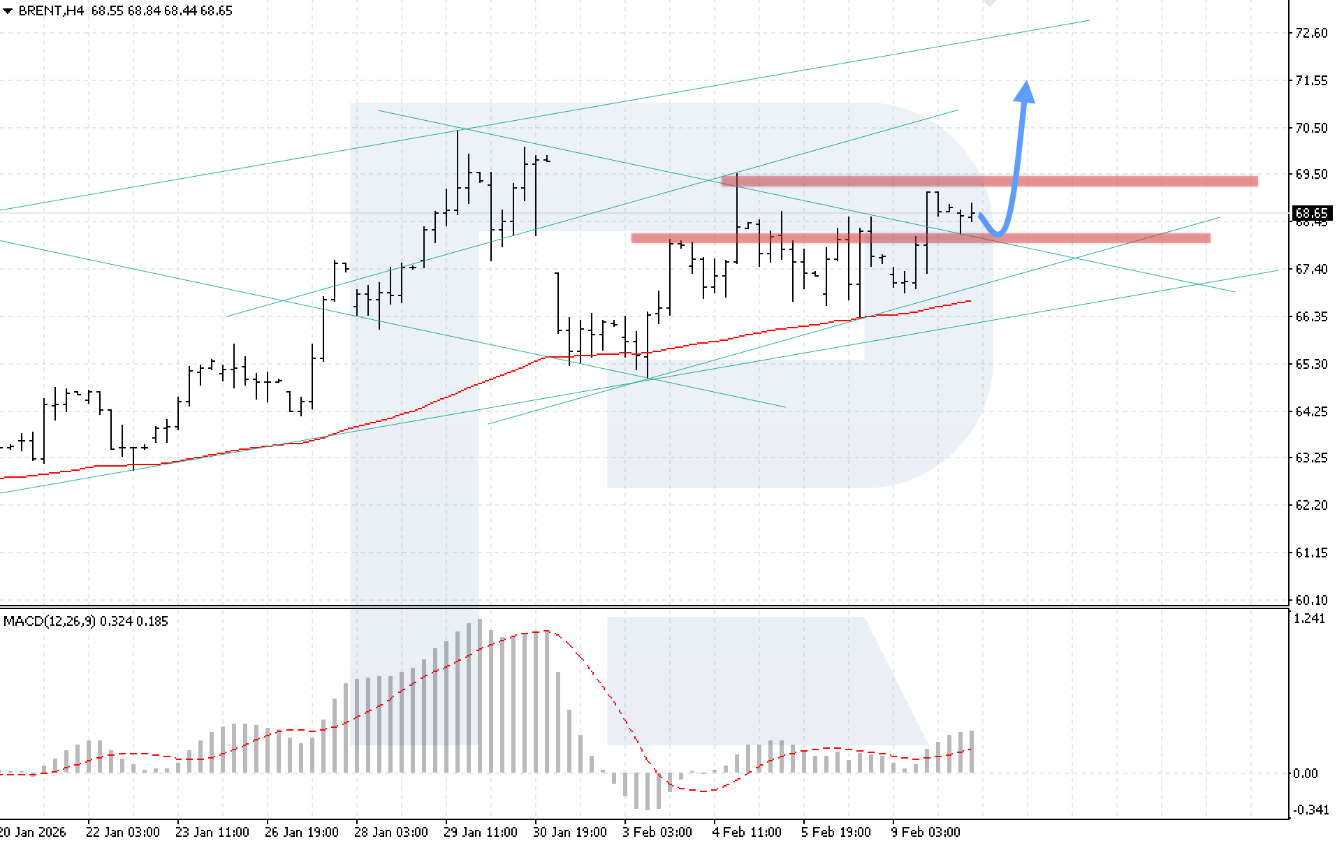 บนกราฟ H4 ของน้ำมันดิบ Brent ตลาดได้สิ้นสุดคลื่นขาขึ้นระยะสั้น ซึ่งช่วยให้ผู้ซื้อสามารถยืนราคาเหนือขอบบนของช่องขาลงได้ แนวต้านใกล้ที่สุดอยู่ที่ระดับ 69.50 วันนี้ 10 กุมภาพันธ์ 2026 มีการพิจารณาสถานการณ์ของการปรับตัวขึ้นต่อเนื่อง โดยมีเป้าหมายที่ระดับ 71.55 หลังจากการดีดตัวจากขอบบนของช่องที่ถูกทะลุ