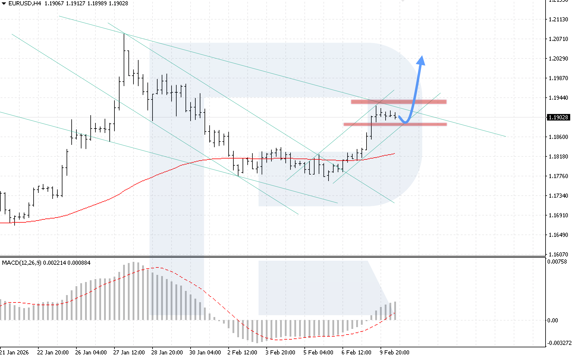 บนกราฟ H4 ของ EURUSD ตลาดกำลังดีดตัวจากขอบบนของช่องขาลง แม้ว่าขณะนี้จะอยู่ในช่วงการปรับฐาน แต่แรงซื้อยังคงมีนัยสำคัญ วันนี้ 10 กุมภาพันธ์ 2026 สถานการณ์หลักบ่งชี้ถึงการดีดตัวจากขอบล่างของช่องขาขึ้นที่ระดับ 1.1895 ตามด้วยการก่อตัวของคลื่นขาขึ้นรอบใหม่ โดยมีเป้าหมายที่ระดับ 1.2030