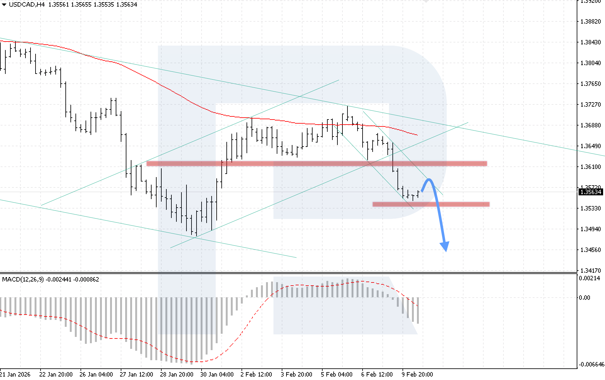 บนกราฟ H4 ของ USDCAD ตลาดยังคงปรับตัวลงภายใต้แรงขายที่รุนแรง หลังจากทะลุขอบล่างของรูปแบบกลับตัว Double Top วันนี้ 10 กุมภาพันธ์ 2026 สถานการณ์หลักบ่งชี้ถึงการปรับตัวลงต่อเนื่อง โดยมีเป้าหมายที่ระดับ 1.3455