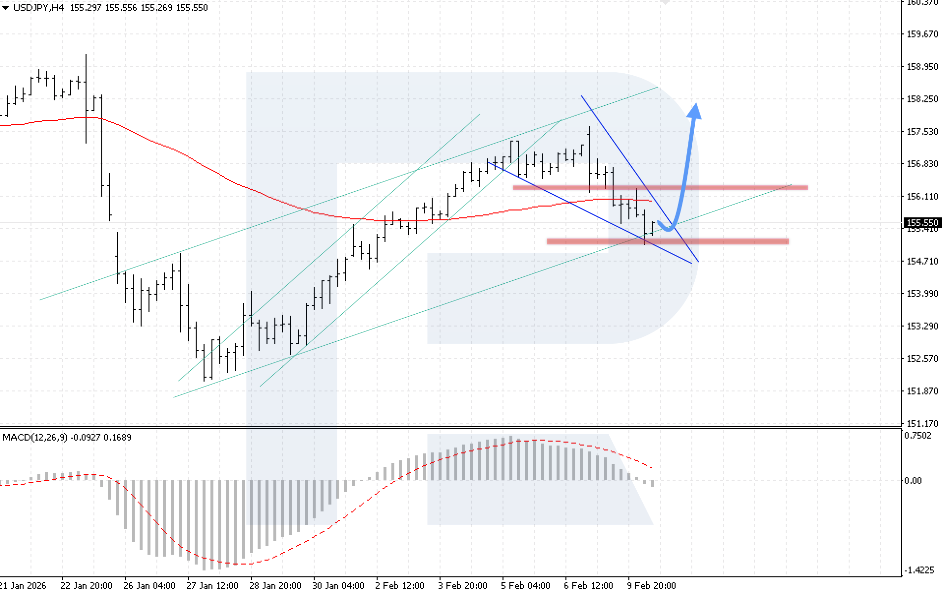 บนกราฟ H4 ของ USDJPY ตลาดอยู่ในช่วงของการปรับฐานขาลงอย่างชัดเจน แม้ว่าราคาจะเคลื่อนไหวต่ำกว่าเส้น EMA-85 แต่ศักยภาพในการก่อตัวของรูปแบบกลับตัว Wedge ยังคงอยู่ โซนแนวรับใกล้ที่สุดอยู่บริเวณระดับ 154.90 วันนี้ 10 กุมภาพันธ์ 2026 สถานการณ์หลักบ่งชี้ถึงการกลับมาของการปรับตัวขึ้น โดยมีเป้าหมายที่ระดับ 158.25 ตามสัญญาณของรูปแบบกลับตัว