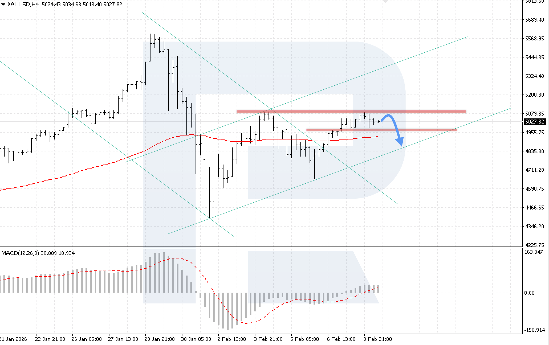 บนกราฟ H4 ของ XAUUSD ตลาดกำลังปรับตัวลงหลังจากดีดตัวจากแนวต้านในพื้นที่ 5,080 แนวรับใกล้ที่สุดอยู่ที่ระดับ 4,955 วันนี้ 10 กุมภาพันธ์ 2026 มีการพิจารณาสถานการณ์ของการปรับตัวลงต่อเนื่องหลังการดีดตัว โดยมีเป้าหมายที่ระดับ 4,845