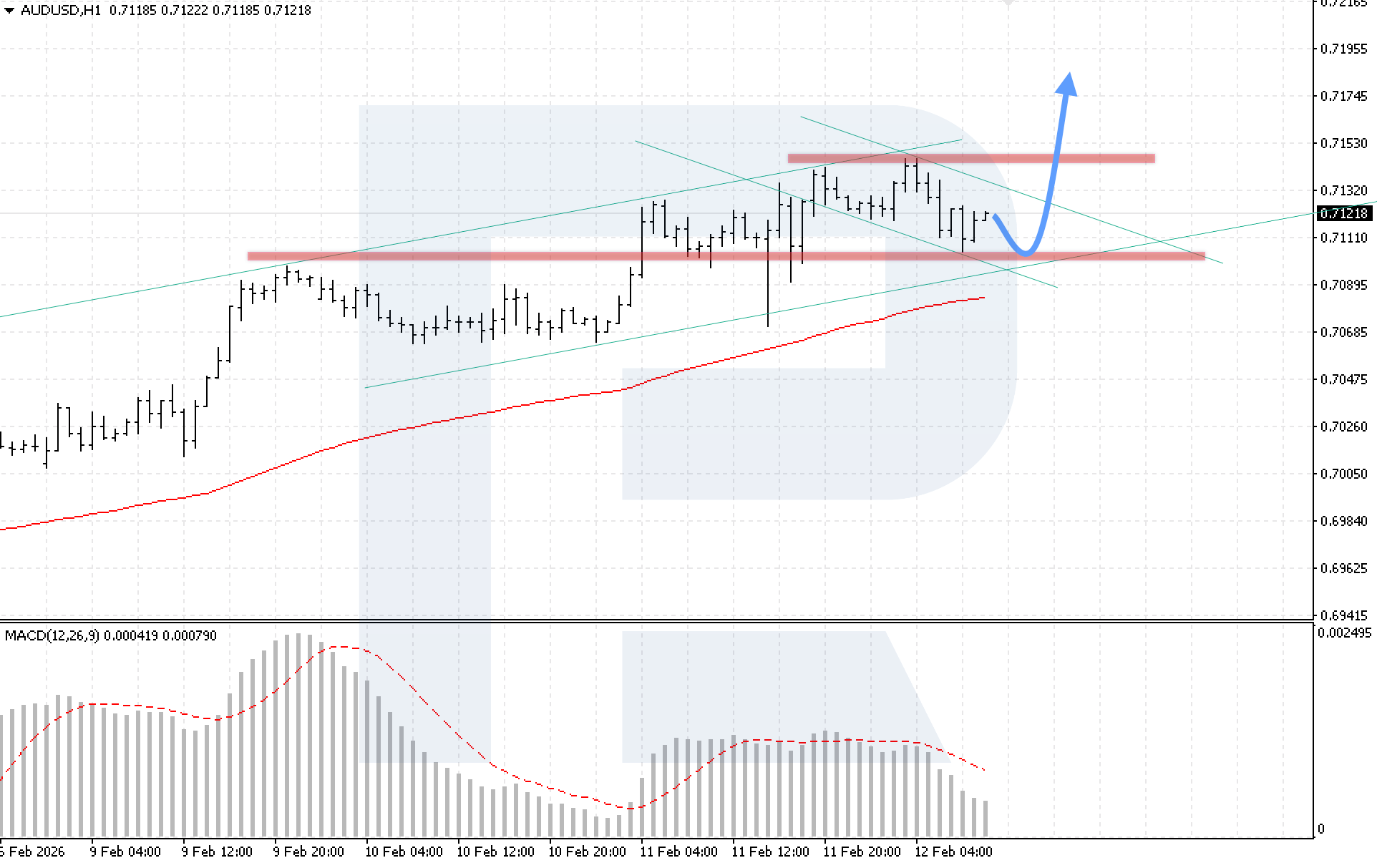 บนกราฟ H4 ของคู่สกุลเงิน AUDUSD ตลาดยังคงอยู่ในช่วงปรับฐาน ขณะที่ราคายังคงเคลื่อนไหวเหนือเส้น EMA-85 ซึ่งบ่งชี้ถึงแรงกดดันฝั่งขาขึ้นที่ยังคงอยู่ วันนี้ 12 กุมภาพันธ์ 2026 สถานการณ์หลักพิจารณาการต่อเนื่องของแรงขาขึ้นหลังการดีดตัวจากขอบล่างของช่อง โดยมีเป้าหมายที่ระดับ 0.7185