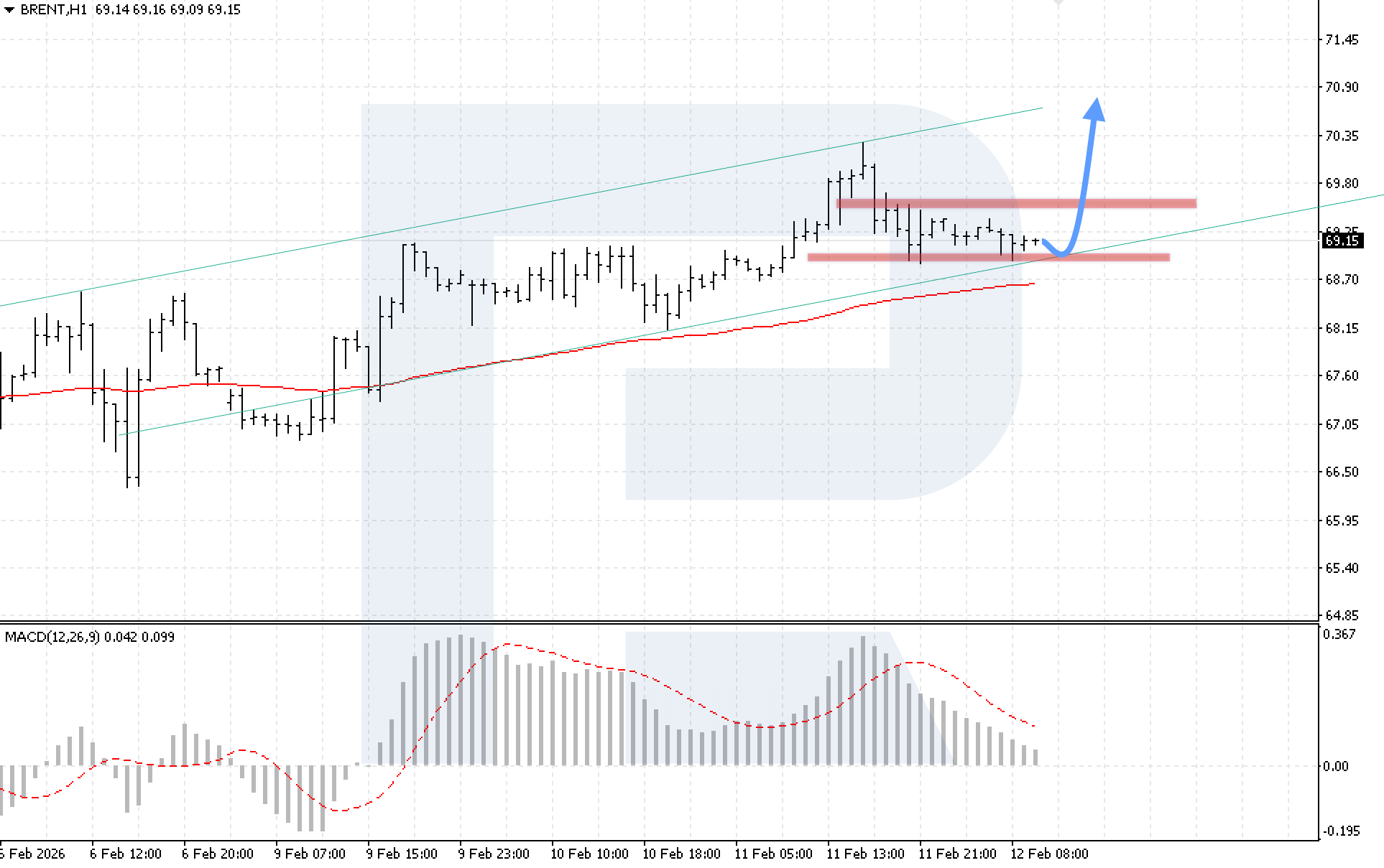 บนกราฟ H4 ของน้ำมันดิบ Brent ตลาดกำลังปรับฐานภายในช่องขาขึ้น ขณะที่ผู้ซื้อพยุงราคาให้อยู่เหนือเส้น EMA-85 มีความเสี่ยงของการก่อตัวรูปแบบกลับตัว Double Bottom หลังจากราคาดีดตัวจากแนวรับที่ 69.00 เป็นครั้งที่สอง วันนี้ 12 กุมภาพันธ์ 2026 สถานการณ์หลักพิจารณาการต่อเนื่องของคลื่นขาขึ้นหลังการดีดตัวจากขอบล่างของช่อง โดยมีเป้าหมายที่ระดับ 70.85