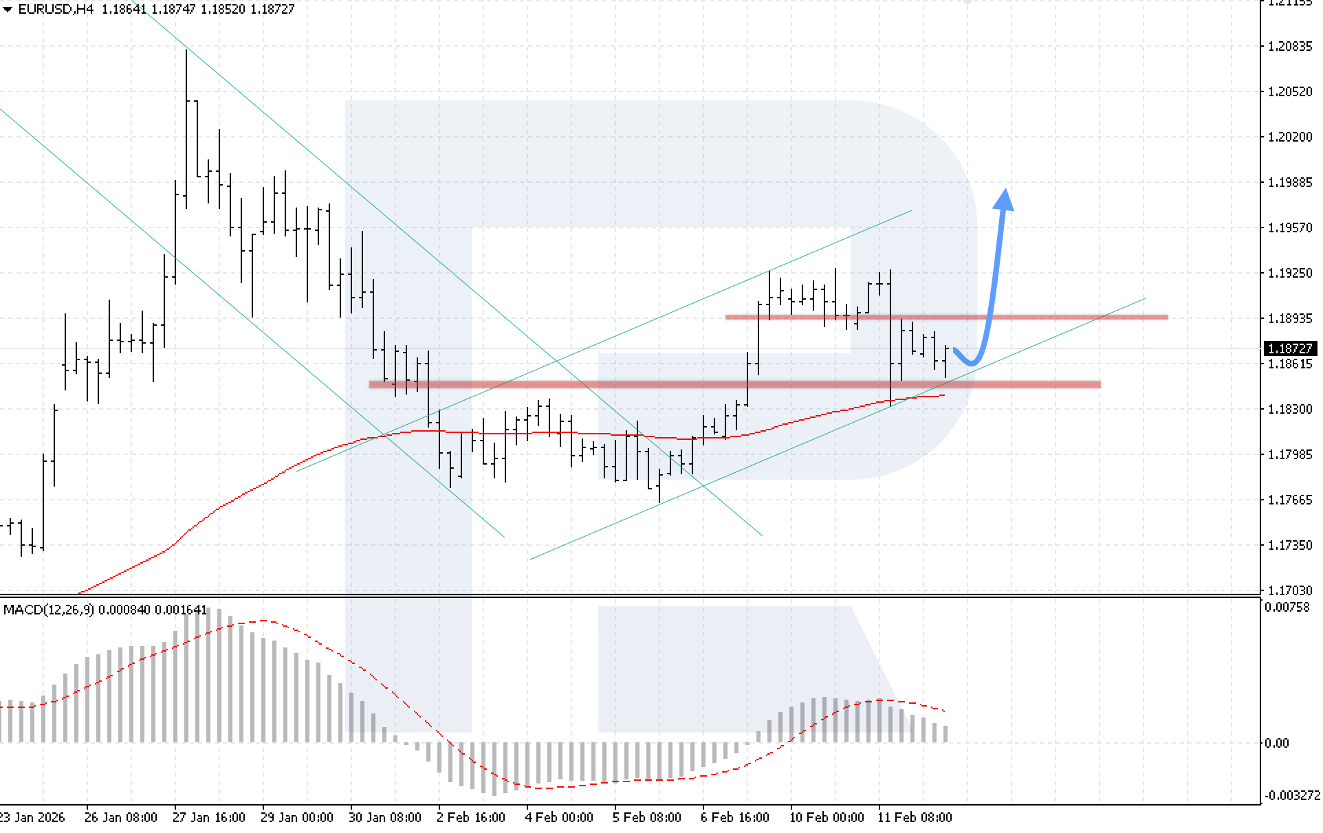 บนกราฟ H4 ของคู่สกุลเงิน EURUSD ตลาดอยู่ในช่วงปรับฐานหลังจากทะลุกรอบสะสมกำลัง แม้จะมีการปรับตัวลงล่าสุด แต่ผู้ซื้อยังคงพยุงราคาให้อยู่เหนือเส้น EMA-85 วันนี้ 12 กุมภาพันธ์ 2026 สถานการณ์หลักยังคงเป็นการดีดตัวจากขอบล่างของช่องขาขึ้นที่ระดับ 1.1905 ตามด้วยการปรับตัวขึ้นสู่ระดับ 1.1985
