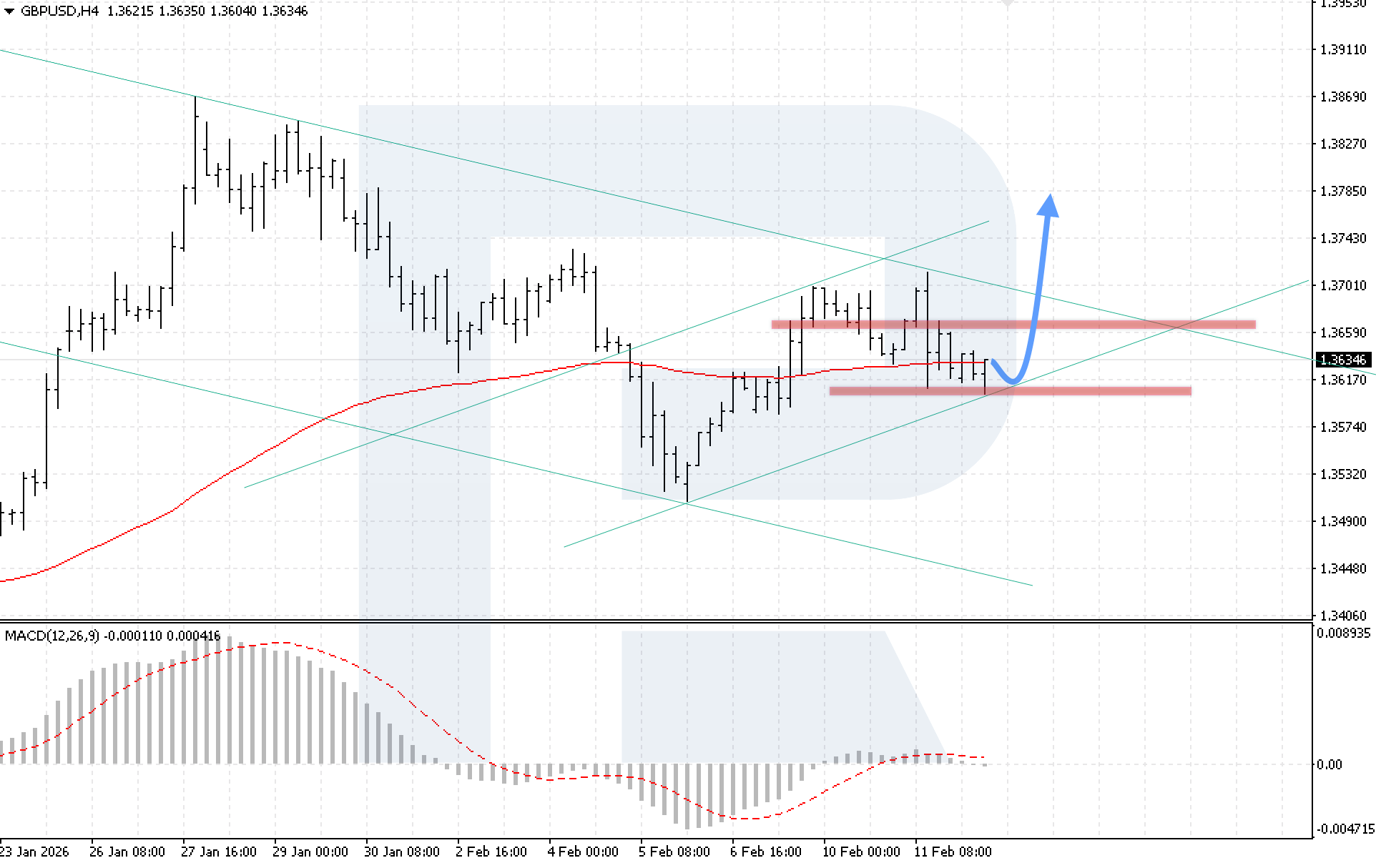 บนกราฟ H4 ของคู่สกุลเงิน GBPUSD ราคายังคงเคลื่อนไหวภายในช่วงปรับฐาน ขณะที่ผู้ซื้อพยายามยืนราคาเหนือเส้น EMA-85 แนวรับใกล้ที่สุดอยู่ที่ระดับ 1.3605 วันนี้ 12 กุมภาพันธ์ 2026 สถานการณ์หลักพิจารณาการดีดตัวจากขอบล่างของช่องขาขึ้น ตามด้วยการปรับตัวขึ้นสู่ระดับ 1.3785