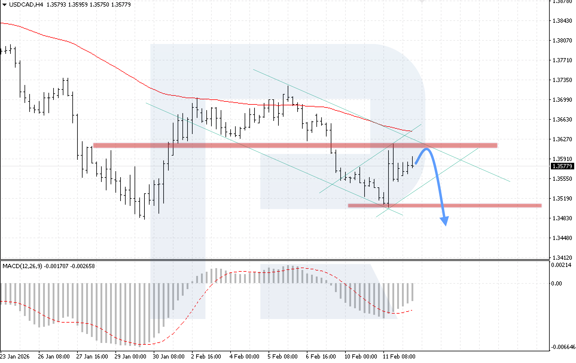 ภาพทางเทคนิคยืนยันสถานการณ์ขาลง โดยอินดิเคเตอร์ MACD แสดงการชะลอตัวของการเติบโต และการดีดตัวอีกครั้งจาก 1.3595 จะเป็นสัญญาณของแรงขายที่แข็งแกร่งขึ้น เงื่อนไขสำคัญสำหรับการปรับตัวลงต่อเนื่องคือการยืนราคาต่ำกว่า 1.3535 ซึ่งจะบ่งชี้ถึงการทะลุขอบล่างของช่องปรับฐาน