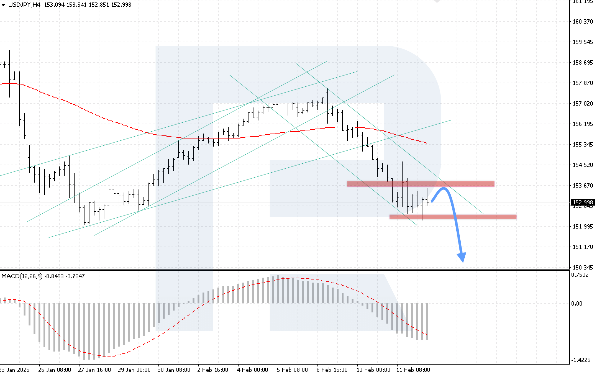 บนกราฟ H4 ของคู่สกุลเงิน USDJPY ตลาดกำลังปรับตัวลงอย่างต่อเนื่องภายในช่องขาลง หลังจากดีดตัวจากแนวต้านที่ 153.65 โซนแนวรับใกล้ที่สุดอยู่ที่ระดับ 152.15 วันนี้ 12 กุมภาพันธ์ 2026 สถานการณ์หลักพิจารณาการปรับตัวลงต่อเนื่องของคู่เงิน โดยมีเป้าหมายที่ระดับ 150.55