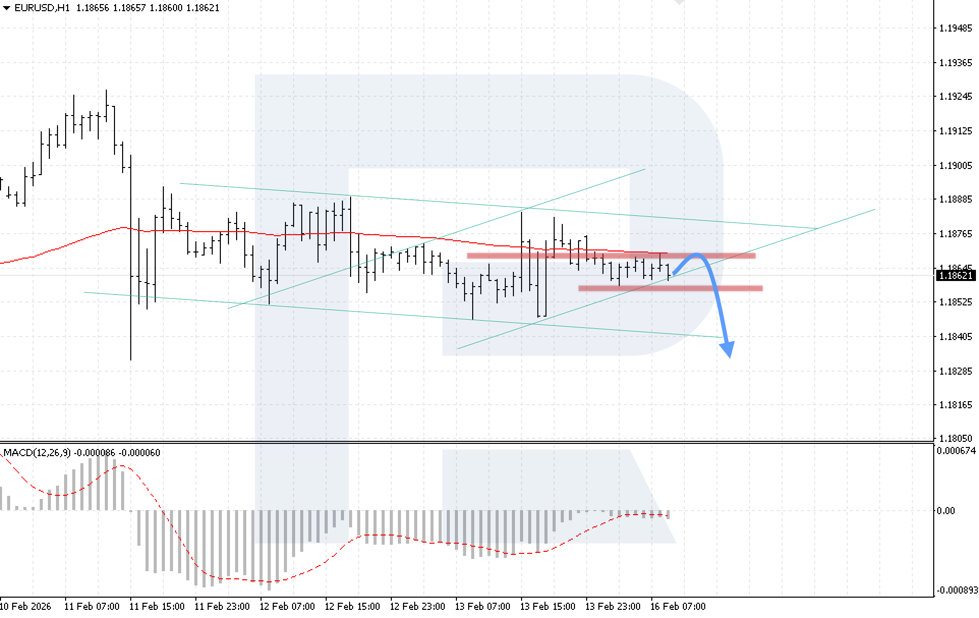 บนกราฟ H1 ของคู่สกุลเงิน EURUSD ตลาดยังคงเคลื่อนไหวภายในช่วงสะสมกำลัง ราคาเด้งตัวจากขอบล่างของช่องปรับฐานขาขึ้น ผู้ขายควบคุมราคาให้อยู่ต่ำกว่าเส้น EMA-85 ซึ่งบ่งชี้ถึงแรงกดดันขาลงที่เพิ่มขึ้น วันนี้ 16 กุมภาพันธ์ 2026 สถานการณ์หลักยังคงเป็นการดีดตัวจากแนวต้านระยะสั้นที่ 1.1875 ตามด้วยการปรับตัวลงสู่ระดับ 1.1835
