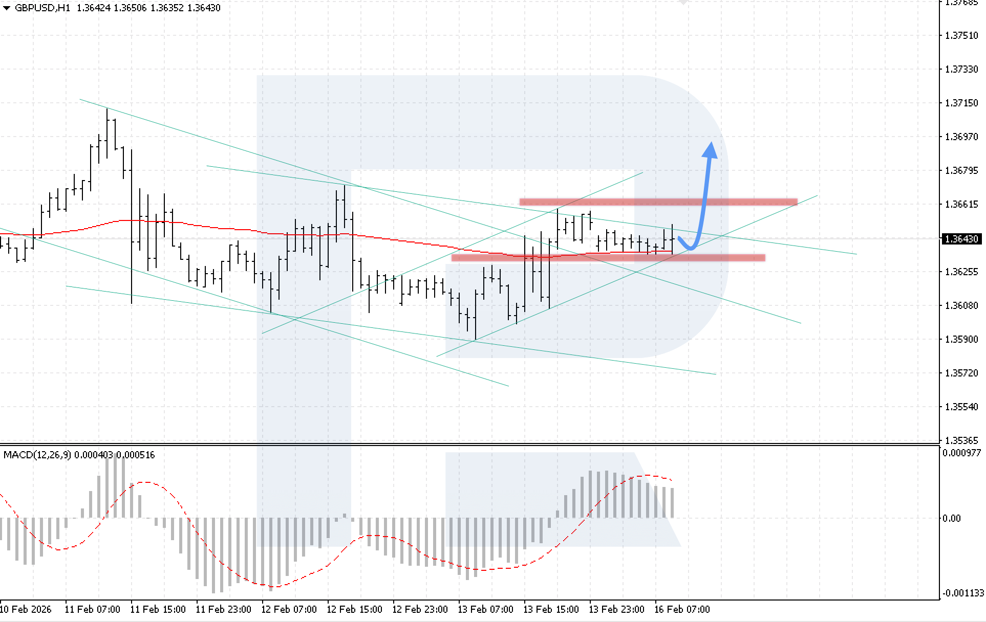 บนกราฟ H1 ของคู่สกุลเงิน GBPUSD ราคายังคงเคลื่อนไหวภายในช่วงปรับฐาน ผู้ซื้อสามารถยืนราคาเหนือเส้น EMA-85 ได้ ซึ่งยืนยันแรงกดดันขาขึ้นที่ยังคงอยู่ แนวต้านใกล้ที่สุดอยู่ที่ 1.3660 วันนี้ 16 กุมภาพันธ์ 2026 สถานการณ์หลักพิจารณาการดีดตัวจากขอบล่างของช่องขาลง ตามด้วยการปรับตัวขึ้นสู่ระดับ 1.3695