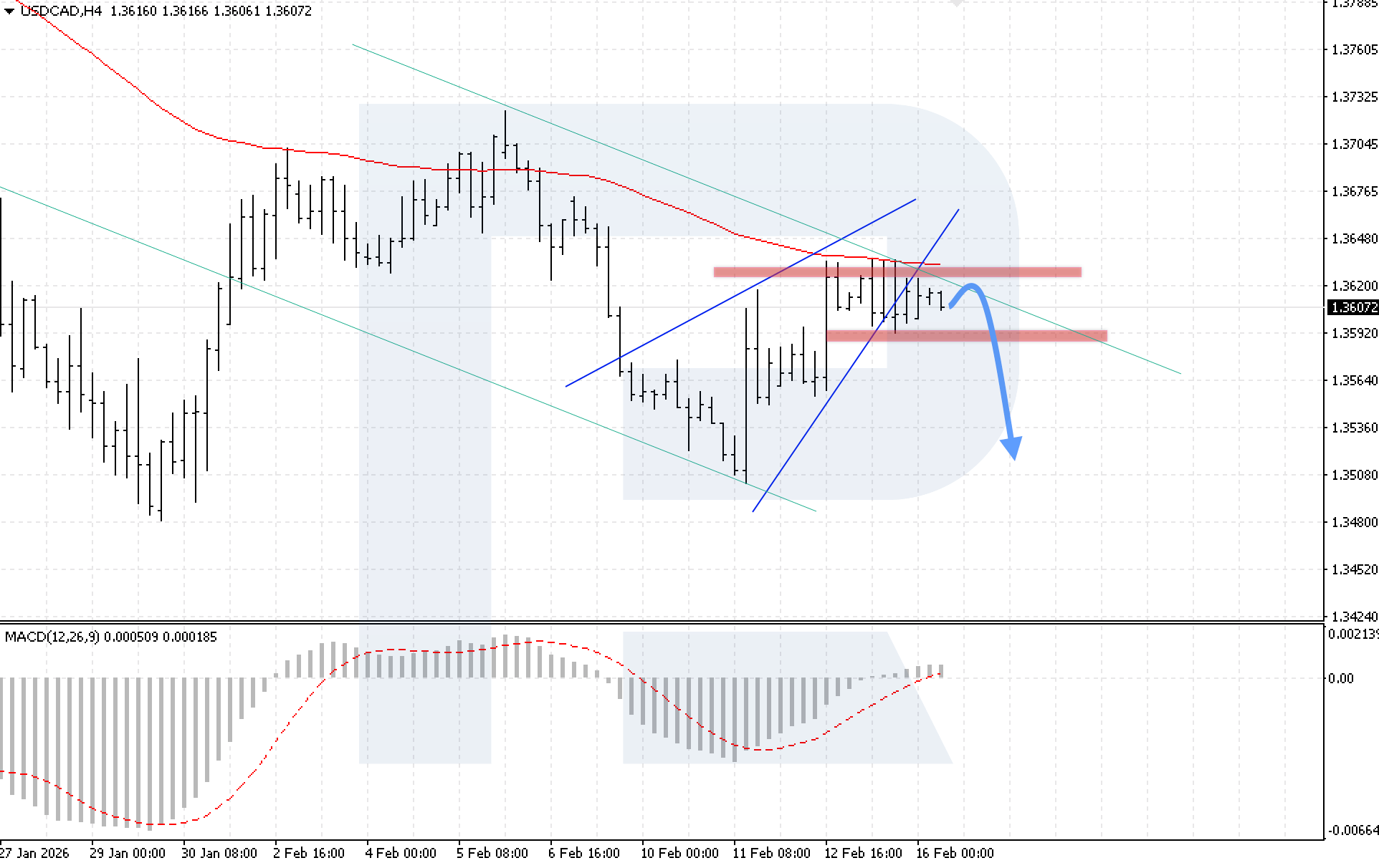 บนกราฟ H4 ของคู่สกุลเงิน USDCAD ตลาดยังคงเคลื่อนไหวภายในช่วงปรับฐานขาขึ้น ขณะที่ราคาได้เคลื่อนไหวหลุดออกจากขอบเขตรูปแบบกลับตัว Wedge วันนี้ 16 กุมภาพันธ์ 2026 สถานการณ์หลักพิจารณาการปรับตัวลงสู่ระดับ 1.3505 หลังการดีดตัวจากขอบบนของช่องขาลง