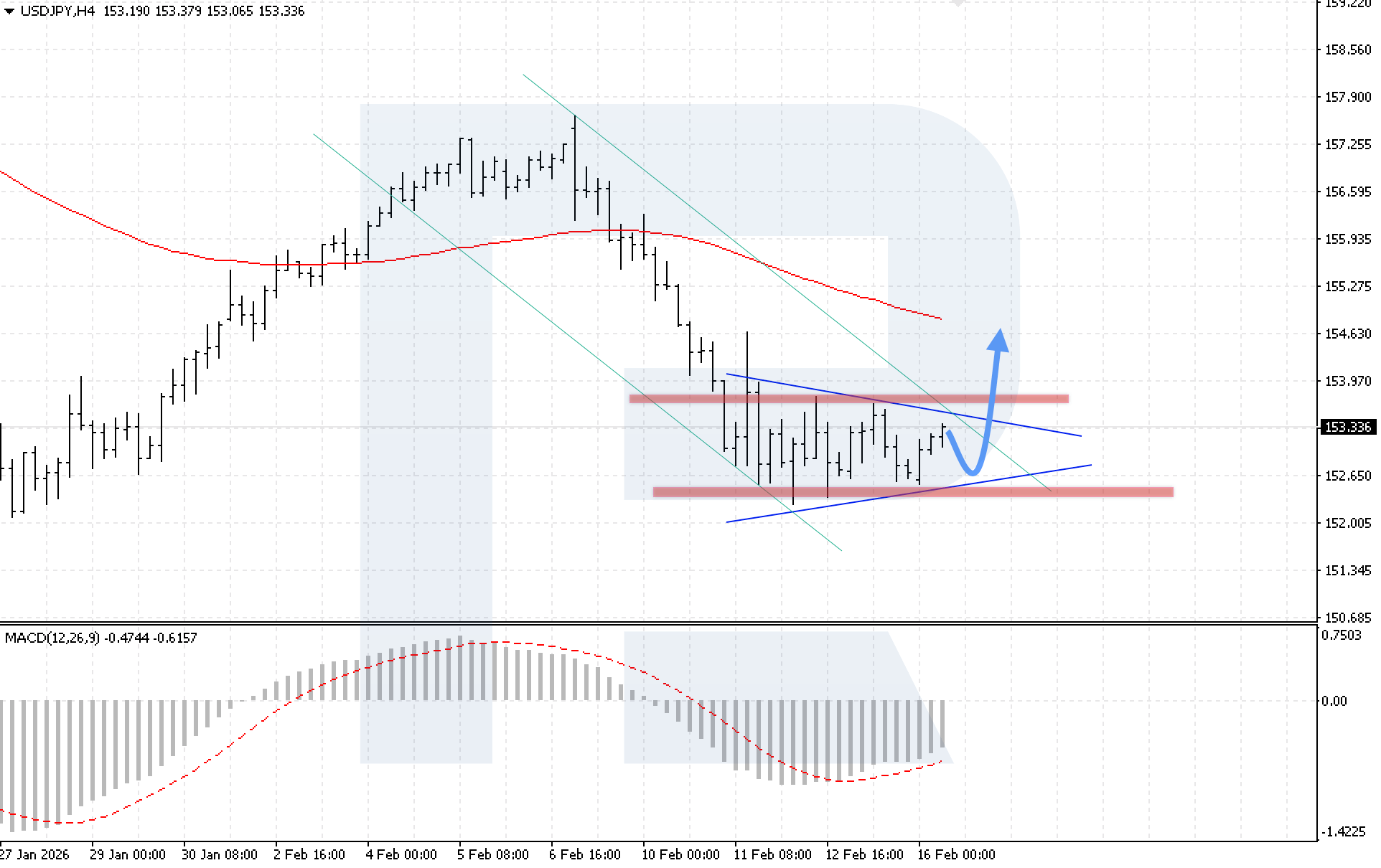 ภาพทางเทคนิคยืนยันสถานการณ์นี้ อินดิเคเตอร์ MACD แสดงการขยายตัวของฮิสโตแกรม และเกิดสัญญาณ bullish divergence ซึ่งจำกัดศักยภาพด้านลบอย่างมีนัยสำคัญ เงื่อนไขสำคัญสำหรับการดำเนินสถานการณ์ขาขึ้นคือการทะลุขอบบนของรูปแบบ พร้อมการยืนราคาสูงกว่า 153.85