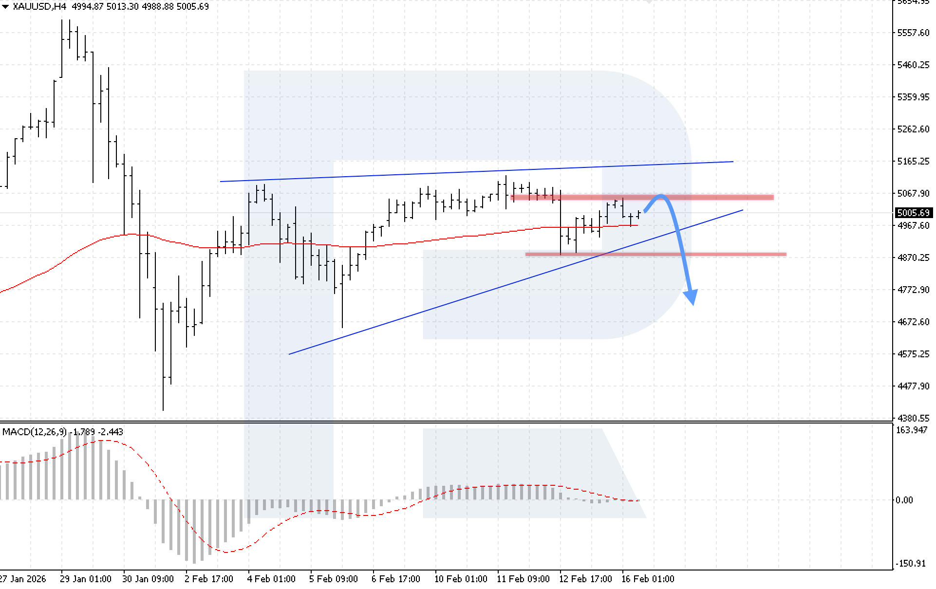 บนกราฟ H4 ของคู่สกุลเงิน XAUUSD ตลาดสามารถยืนราคาเหนือเส้น EMA-75 ได้ อย่างไรก็ตาม ความเสี่ยงของการก่อตัวรูปแบบกลับตัว Wedge ยังคงอยู่ วันนี้ 16 กุมภาพันธ์ 2026 สถานการณ์หลักพิจารณาการพัฒนาแรงกระตุ้นขาลง โดยมีเป้าหมายที่ 4,765