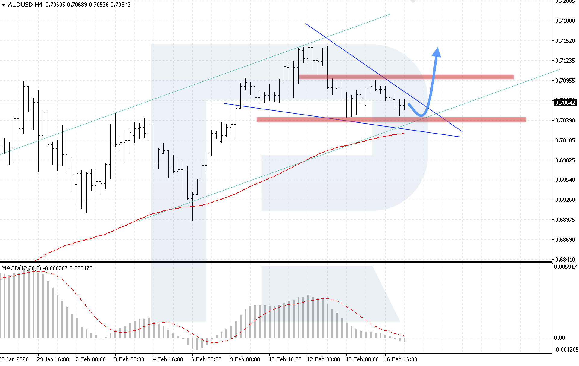 บนกราฟ H4 ของคู่สกุลเงิน AUDUSD ตลาดยังคงก่อตัวคลื่นปรับฐานภายในรูปแบบ Wedge ผู้ซื้อสามารถยืนราคาเหนือเส้น EMA-85 ได้ ซึ่งบ่งชี้ถึงแรงกดดันขาขึ้นที่ยังคงอยู่ วันนี้ 17 กุมภาพันธ์ 2026 สถานการณ์หลักพิจารณาการพัฒนาแรงกระตุ้นขาขึ้นหลังจากดีดตัวจากขอบล่างของช่องขาขึ้น โดยมีเป้าหมายที่ 0.7145