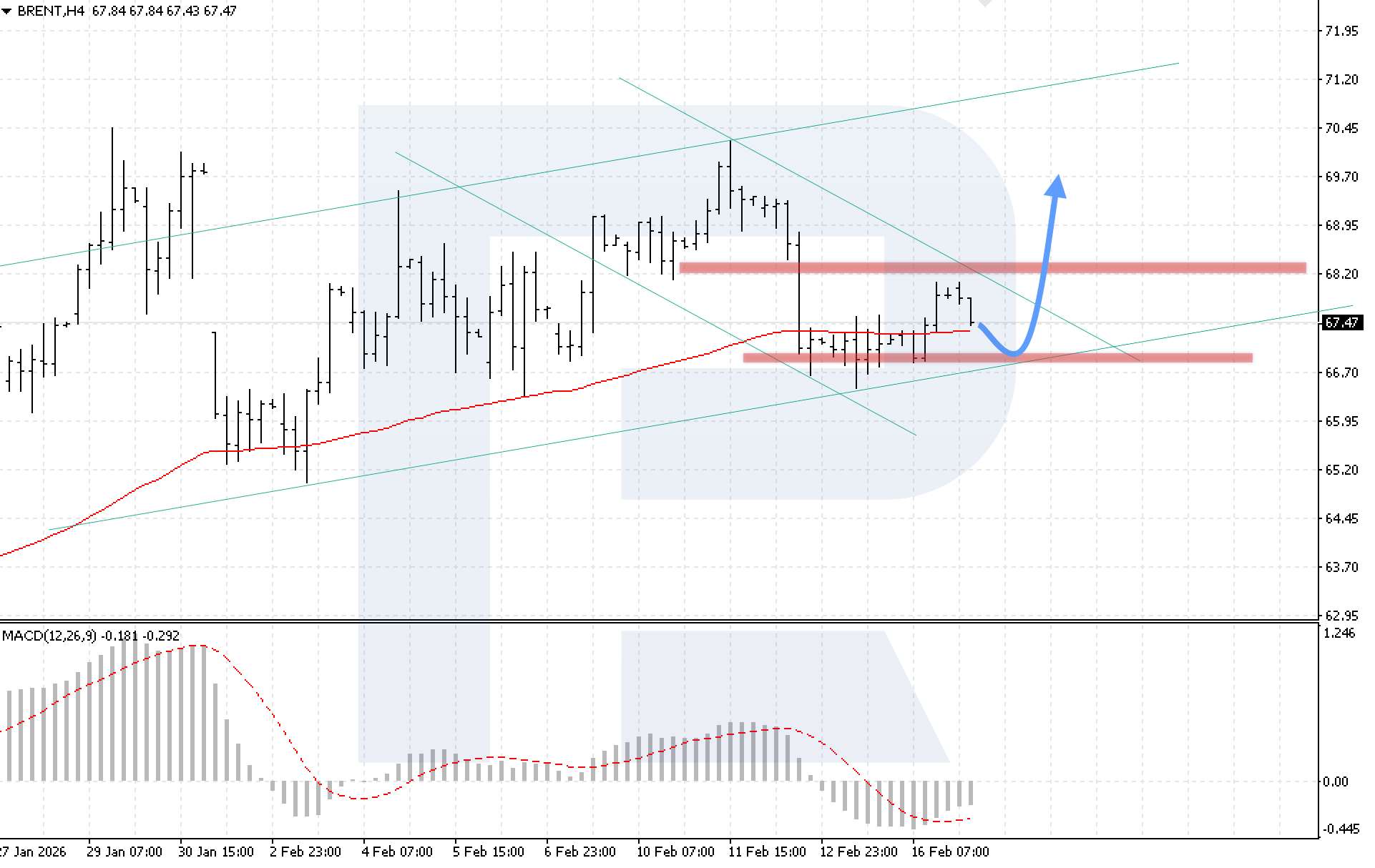 บนกราฟ H4 ของน้ำมันดิบ Brent ตลาดกำลังปรับฐานหลังจากการปรับตัวขึ้น โดยผู้ซื้อสามารถดันราคาเหนือเส้น EMA-85 ได้ วันนี้ 17 กุมภาพันธ์ 2026 สถานการณ์หลักพิจารณาการปรับตัวขึ้นต่อหลังจากดีดตัวจากขอบล่างของช่องขาขึ้น โดยมีเป้าหมายที่ 69.70