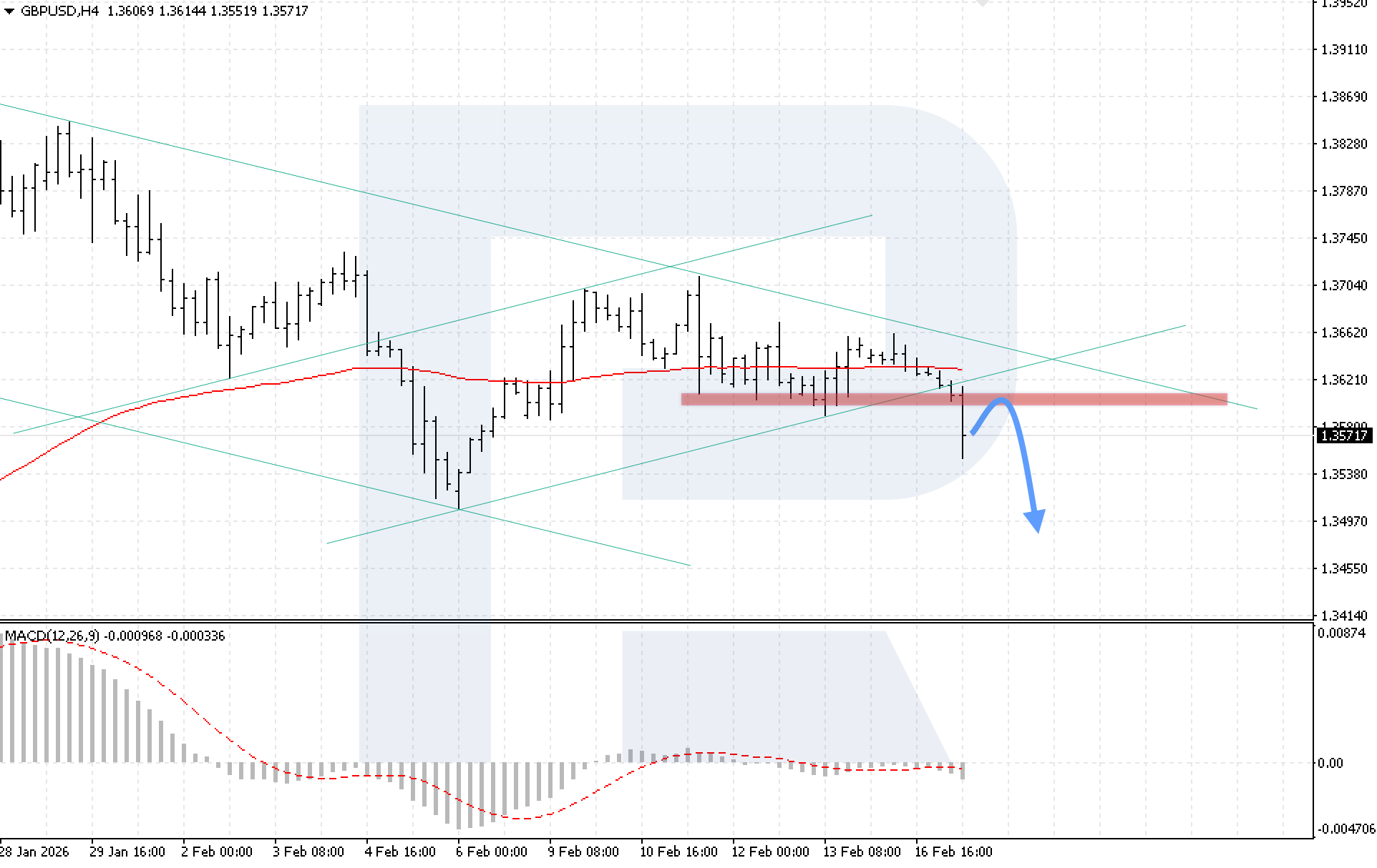 บนกราฟ H4 ของคู่สกุลเงิน GBPUSD ราคาเคลื่อนไหวภายในแนวโน้มขาลงอย่างรุนแรงหลังจากทะลุแนวรับระยะสั้นที่ 1.3595 วันนี้ 17 กุมภาพันธ์ 2026 สถานการณ์หลักพิจารณาการดีดตัวจากแนวต้านที่ถูกทะลุแล้ว ตามด้วยการปรับตัวลงสู่ระดับ 1.3495