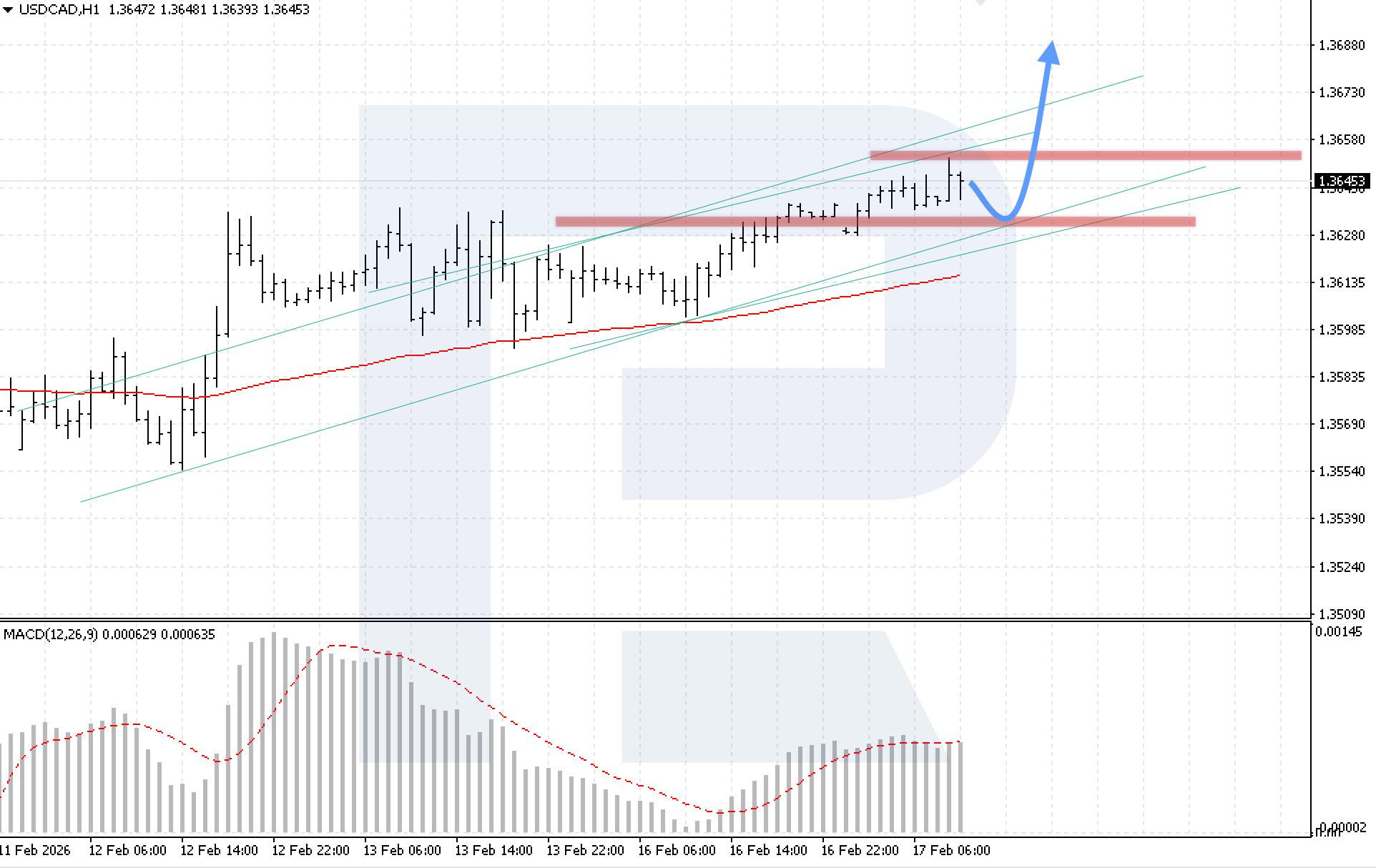 บนกราฟ H1 ของคู่สกุลเงิน USDCAD ตลาดยังคงเคลื่อนไหวขาขึ้นภายในช่องขาขึ้น ผู้ซื้อสามารถทะลุแนวต้านระยะสั้นได้อย่างมั่นใจ วันนี้ 17 กุมภาพันธ์ 2026 สถานการณ์หลักพิจารณาการปรับตัวขึ้นต่อหลังจากดีดตัวจากขอบล่างของช่อง โดยมีเป้าหมายที่ 1.3685