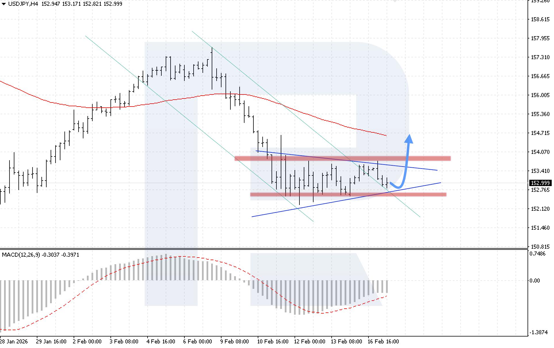 ภาพทางเทคนิคยืนยันสถานการณ์นี้ อินดิเคเตอร์ MACD แสดงการเติบโตของฮิสโตแกรม และเกิด bullish divergence เพิ่มเติม ซึ่งเสริมศักยภาพการเคลื่อนไหวขาขึ้น เงื่อนไขสำคัญสำหรับการดำเนินการขาขึ้นคือการทะลุขอบบนของรูปแบบ Triangle พร้อมการยืนราคาสูงกว่า 153.65