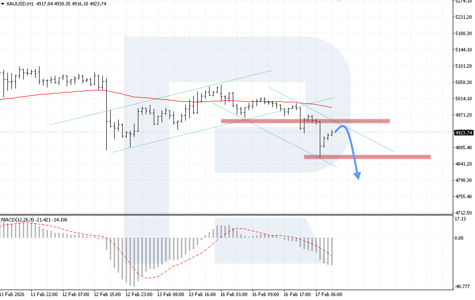 บนกราฟ H1 ของคู่สกุลเงิน XAUUSD ตลาดกำลังปรับฐานหลังจากการปรับตัวลงอย่างรุนแรง ขณะที่ยังคงเคลื่อนไหวภายในช่องขาลง วันนี้ 17 กุมภาพันธ์ 2026 สถานการณ์หลักพิจารณาการกลับมาของแรงกระตุ้นขาลงหลังจากดีดตัวจากขอบบนของช่อง โดยมีเป้าหมายที่ 4,795