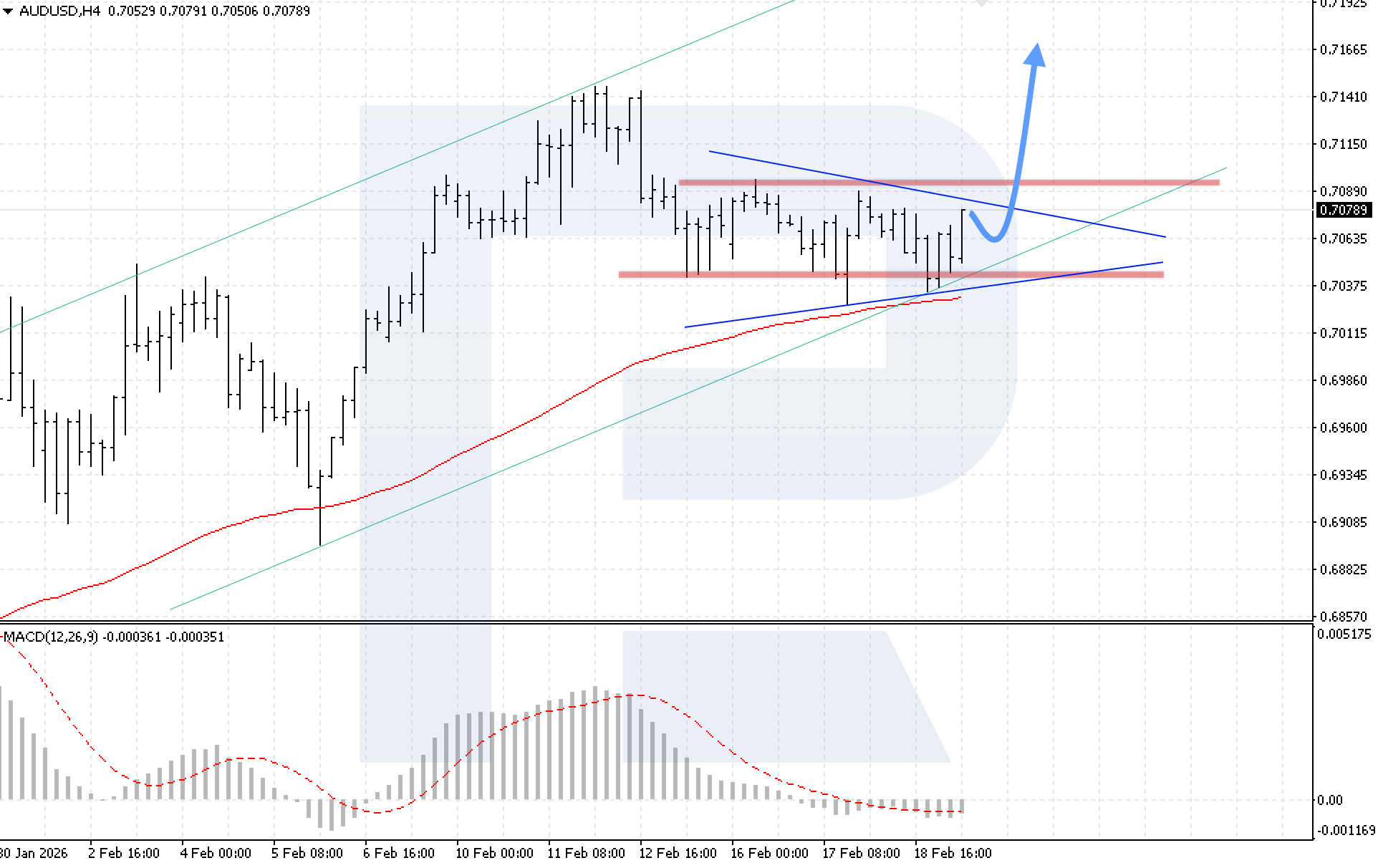 บนกราฟ H4 ของคู่สกุลเงิน AUDUSD ตลาดยังคงก่อตัวคลื่นปรับฐานภายในรูปแบบ Triangle วันนี้ 19 กุมภาพันธ์ 2026 สถานการณ์หลักพิจารณาการปรับตัวขึ้นหลังจากดีดตัวจากขอบล่างของรูปแบบ โดยมีเป้าหมายที่ 0.7175