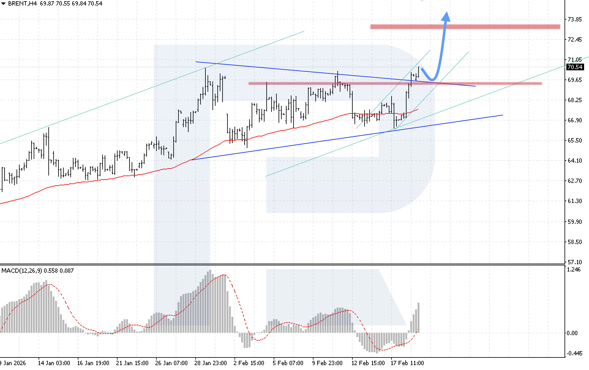 บนกราฟ H4 ของน้ำมันดิบ Brent ตลาดยังคงปรับตัวขึ้นอย่างแข็งแกร่งหลังจากทะลุขอบบนของรูปแบบ Triangle วันนี้ 19 กุมภาพันธ์ 2026 สถานการณ์หลักพิจารณาการดีดตัวจากขอบที่ถูกทะลุของรูปแบบ ตามด้วยการปรับตัวขึ้นสู่ระดับ 73.85