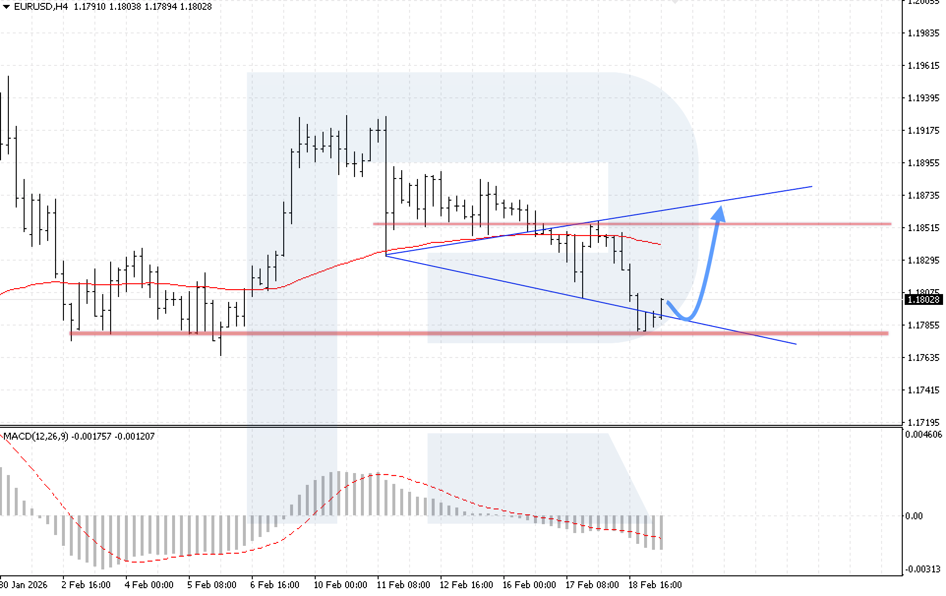 บนกราฟ H4 ของคู่สกุลเงิน EURUSD ตลาดกำลังดีดตัวจากขอบล่างของรูปแบบ Wolfe Wave ขาขึ้น ซึ่งบ่งชี้ถึงความเป็นไปได้ของการสิ้นสุดแนวโน้มขาลง วันนี้ 19 กุมภาพันธ์ 2026 สถานการณ์หลักยังคงเป็นการดีดตัวจากขอบล่างของรูปแบบ ตามด้วยการปรับตัวขึ้นต่อเนื่องสู่ระดับ 1.1865