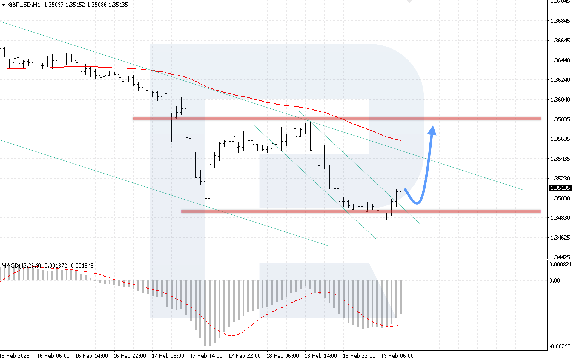 บนกราฟ H1 ของคู่สกุลเงิน GBPUSD ราคากำลังปรับตัวขึ้นและก่อตัวรูปแบบกลับตัว Double Bottom โดยราคาได้ทะลุออกจากช่องขาลงแล้ว ซึ่งบ่งชี้ถึงแรงกดดันขาขึ้นใกล้แนวรับสำคัญ วันนี้ 19 กุมภาพันธ์ 2026 สถานการณ์หลักพิจารณาการดีดตัวจากขอบบนของช่อง ตามด้วยการปรับตัวขึ้นสู่ระดับ 1.3575