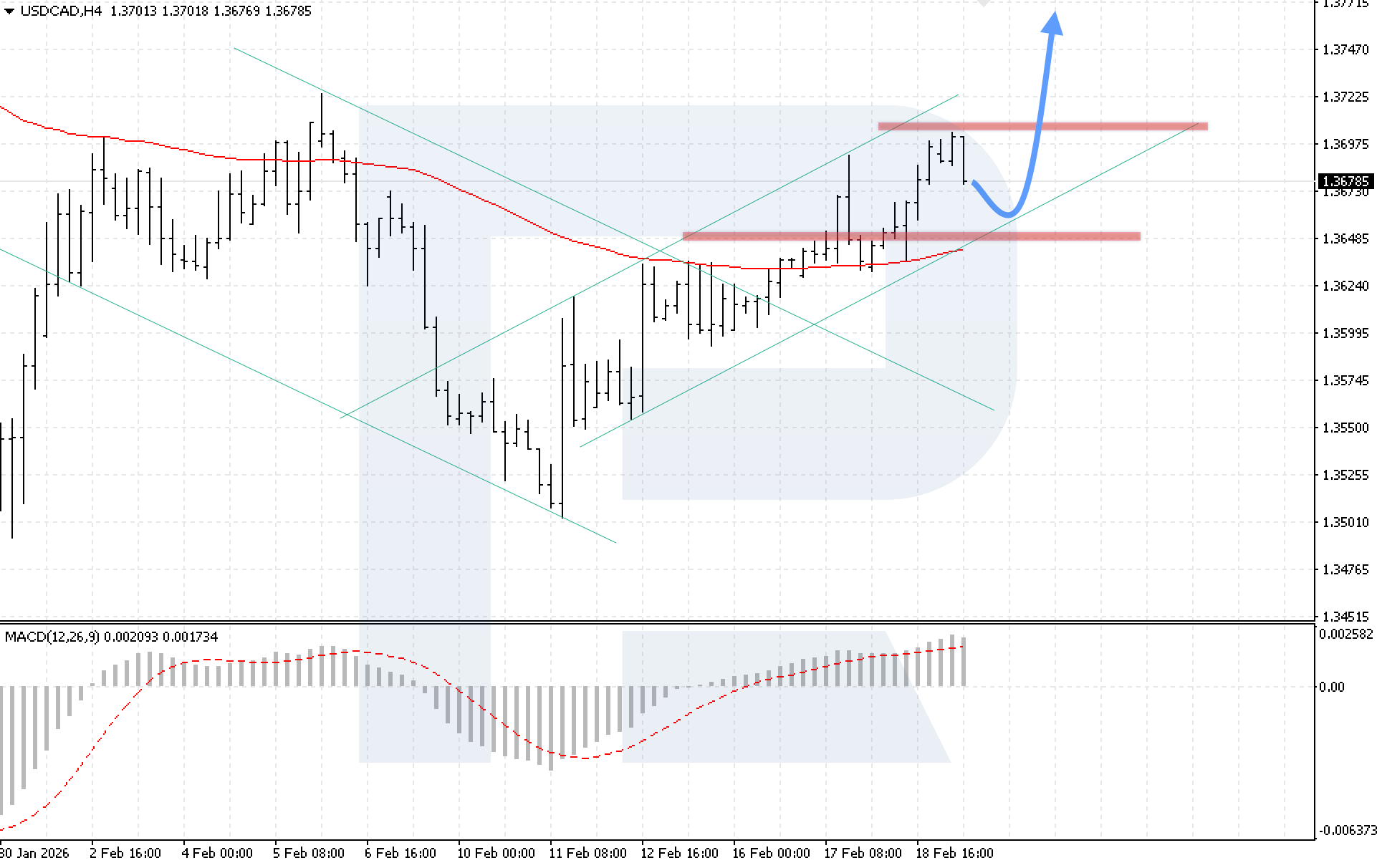 บนกราฟ H1 ของคู่สกุลเงิน USDCAD ตลาดยังคงเคลื่อนไหวภายในแรงกระตุ้นขาขึ้น พร้อมความพยายามก่อตัวการปรับฐาน วันนี้ 19 กุมภาพันธ์ 2026 สถานการณ์หลักพิจารณาการปรับตัวขึ้นต่อเนื่องสู่ระดับ 1.3785 หลังจากดีดตัวจากขอบล่างของช่องขาขึ้น
