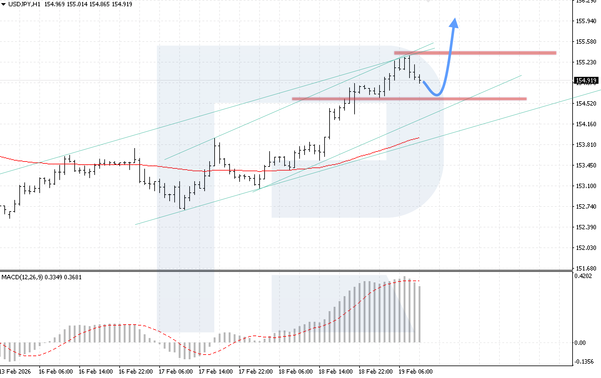 บนกราฟ H1 ของคู่สกุลเงิน USDJPY ตลาดกำลังปรับฐานหลังจากดีดตัวจากขอบบนของช่องขาขึ้น วันนี้ 19 กุมภาพันธ์ 2026 สถานการณ์หลักพิจารณาการปรับตัวลงสู่แนวรับที่ 154.65 ตามด้วยการกลับมาปรับตัวขึ้นสู่ระดับ 155.95