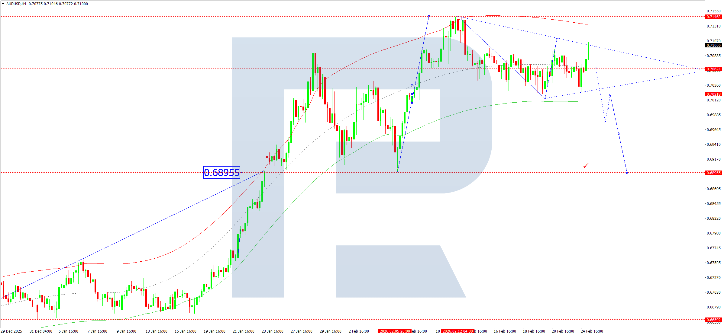 บนกราฟ H4 ของคู่ AUDUSD ตลาดกำลังก่อตัวกรอบสะสมตัวบริเวณ 0.7060 วันนี้ 25 กุมภาพันธ์ 2026 หากราคาทะลุขึ้นจากกรอบนี้ จะเปิดศักยภาพสำหรับการปรับตัวขึ้นสู่ 0.7150 ในกรณีที่ทะลุลงด้านล่าง คาดว่าจะปรับตัวลงสู่ 0.7020 ตามด้วยความเป็นไปได้ของการสะสมตัวบริเวณดังกล่าว