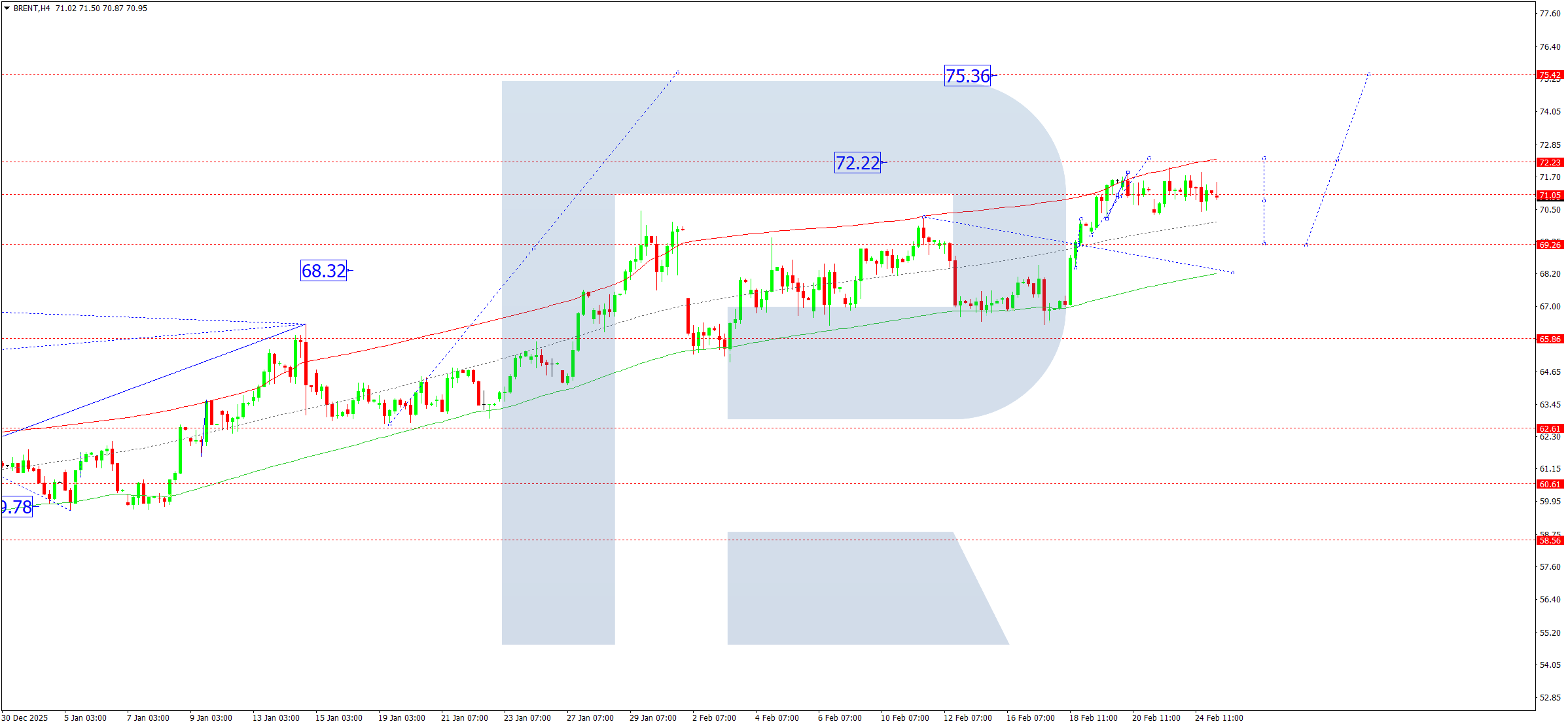 บนกราฟ H4 ของน้ำมันดิบ Brent ตลาดกำลังก่อตัวกรอบสะสมตัวบริเวณ 71.00 วันนี้ 25 กุมภาพันธ์ 2026 คาดว่าจะมีคลื่นขาขึ้นสู่ 72.22 จากนั้นเริ่มต้นการปรับตัวลงสู่ 69.00