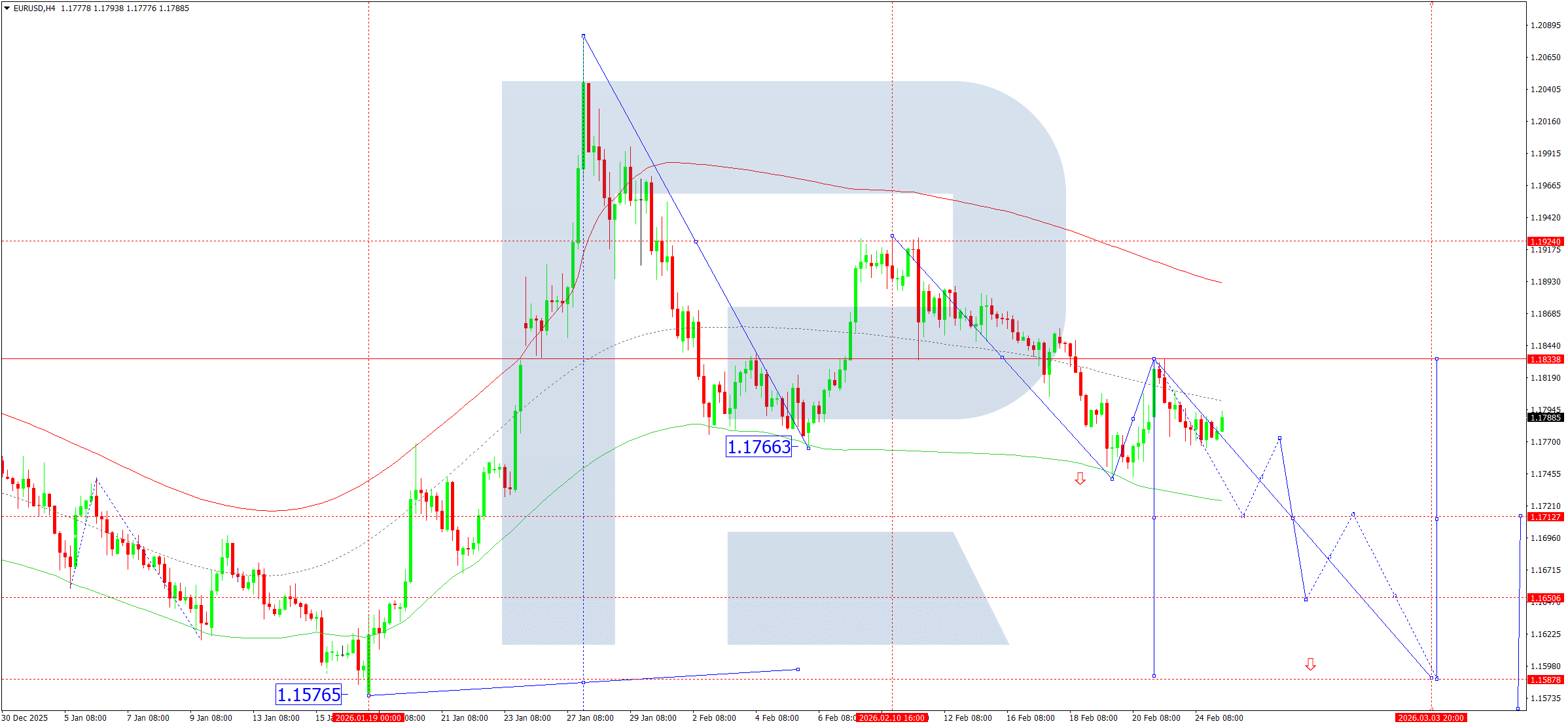 บนกราฟ H4 ของคู่ EURUSD ตลาดได้สิ้นสุดคลื่นขาลงที่ระดับ 1.1766 และเริ่มก่อตัวกรอบสะสมตัวเหนือระดับดังกล่าว วันนี้ 25 กุมภาพันธ์ 2026 หากราคาทะลุขึ้นด้านบน เราจะพิจารณาความเป็นไปได้ของการปรับฐานสู่ 1.1870 ในกรณีที่ทะลุลงด้านล่าง จะเปิดศักยภาพสำหรับการปรับตัวลงสู่ 1.1717 พร้อมแนวโน้มขยายตัวสู่ 1.1650 โดยเป้าหมายเป็นลักษณะระยะสั้น (local)